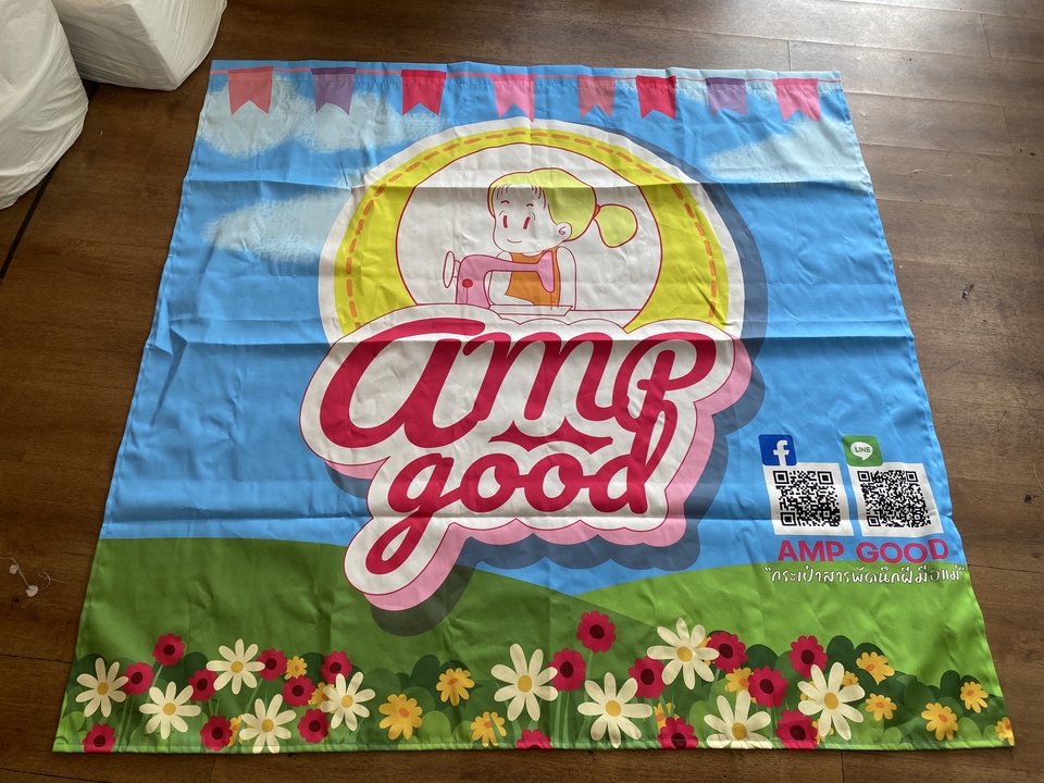 ครบเครื่องเรื่องออกบูธสินค้า ไม่ว่าจะเป็นป้ายผ้าbackdrop ผ้าคลุมโต๊ะ ธงราวตกแต่งบูธ สามารถออกแบบให้ได้เพื่อการใช้งานออกบูธสินค้าได้ตามความต้องการของลูกค้า ขั้นตอนการทำงาน 1. ลูกค้าแจ้งสิ่งต้องการที่อยากได้ (แบบโลโก้,แบบป้ายผ้า,งานผ้าสำเร็จ) 2. เราออกแบบเป็นเวลา 2-3วัน (หากงานโลโก้ ส่งไฟล์พร้อมชำระเงิน) 3. หากผลิตงานผ้าสำเร็จ ใช้เวลาผลิต3-5วันหลังคอนเฟิร์มแบบ 4. ชำระเงินก่อนผลิต มัดจำ50% ที่เหลือชำระวันส่งงาน
