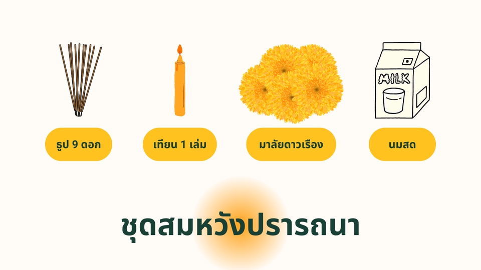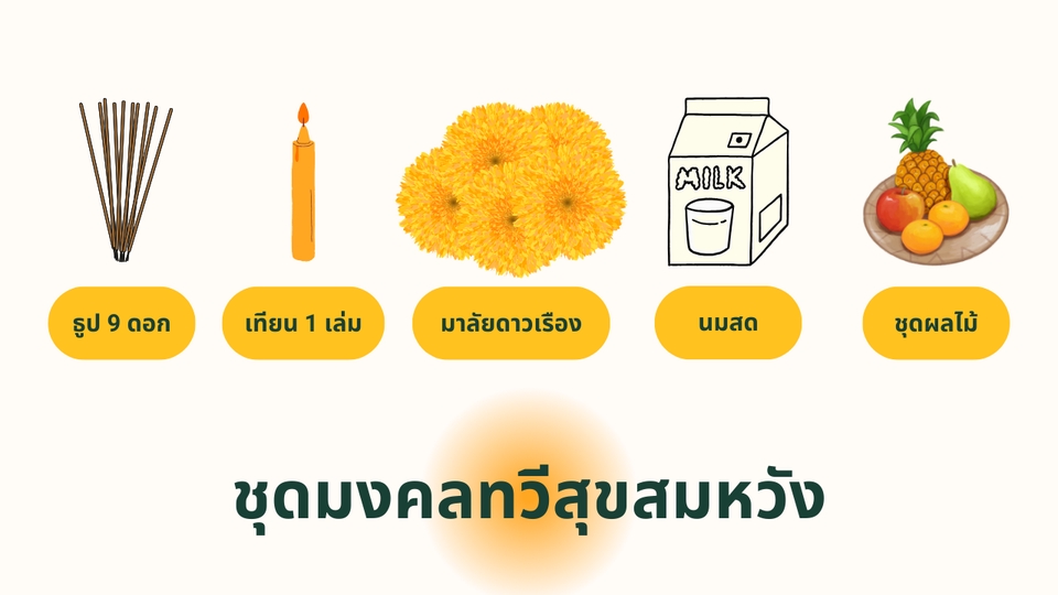 ฿4991. ธูป 9 ดอก 2. เทียน 3. มาลัยดาวเรือง 4. นม