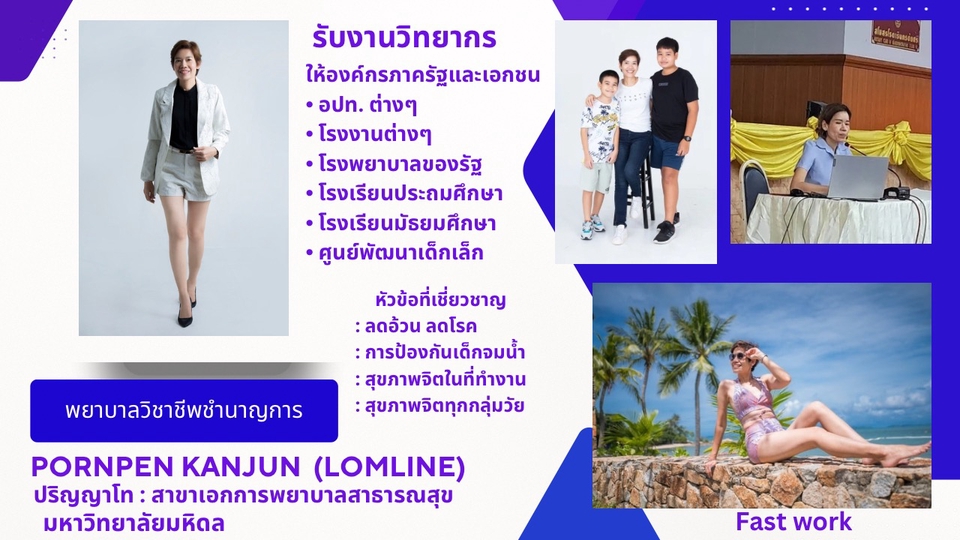 รับงานวิทยากร 1.เกี่ยวกับการลดไขมัน 2.ปัญหาสุขภาพจิตในที่ทำงาน 3.การป้องกันเด็กจมน้ำในศูนย์พัฒนาเด็กเล็ก