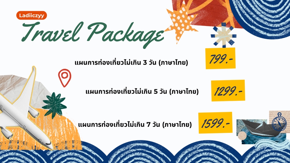 ฿799แผนการเดินทางอย่างละเอียดพร้อมภาพ รูปแบบ PDF ข้อมูลสำคัญ เวลาเปิด-ปิดสถานที่ต่างๆ แผนที่การเดินทางในรูปแบบ Google Map สรุปค่าใช้จ่ายเบื้องต้น เบอร์โทรสำหรับเกิดเหตุฉุกเฉิน แนะนำที่พัก ร้านอาหาร คาเฟ่ และสถานที่ถ่ายรูป เอกสารต่างๆเพิ่มเติม เช่น ใบจองที่พัก ใบจองเข้าสถานที่ต่างๆ (หากเพิ่มบริการจองตั๋วเพิ่มเติม)