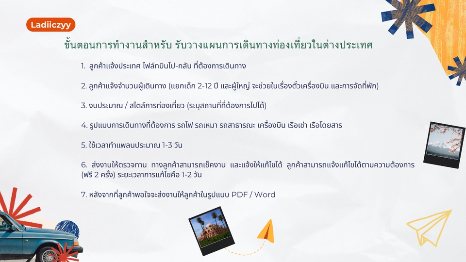 รับทำแพลนเที่ยว ออกแบบเส้นทาง วางแผนการเดินทางสำหรับคนที่ไม่มีเวลาหาข้อมูลหรือเตรียมแพลนเอง สำหรับต่างประเทศ (ไม่ว่าจะเป็น ญี่ปุ่น เกาหลี เซี่ยงไฮ้ ปักกิ่ง สิงคโปร์ ฮ่องกง มาเก๊า ไต้หวัน เวียดนาม และอื่นๆ) เที่ยวง่ายๆไม่ต้องง้อทัวร์ อยากจัดทริป อยากไปเที่ยว ไม่ว่าจะทริปบริษัท เดินทางส่วนตัว ไปกับเพื่อน แฟน หรือครอบครัว อยากเที่ยวสายธรรมชาติ | สายมูเตลู | สายลุย | ทาสหมาทาสแมว | สายกิน ช้อป | ประหยัด | หรูหรา | ชิว ๆ 💰 ทำแพลนตามงบ ✈️ สิ่งที่ลูกค้าจะได้รับ: ✅ ตารางแพลนเที่ยว พร้อมรูปประกอบ ✅ วิธีเดินทาง ✅ ร้านอาหาร คาเฟ่แนะนำ ✅ Google Map พร้อมปักหมุด จองที่พัก Airbnb / จองโรงแรม🚊 ดูแลเที่ยวรถไฟ รถบัส เช่ารถ ⛑️ ประกันการเดินทาง 🛃 รับทำเอกสารต่างๆเพื่อเดินทางเข้าประเทศ 📌 1: ชี้พิกัด กิน ช้อป เที่ยวแบบไม่อั้นตามสไตล์ลูกค้า 📌 2: แนบลิ้งค์สถานที่ลงในแผนการเดินทาง 📌 3: เดินทางง่ายไม่หลง ระบุสายรถไฟ รถบัส ประตูที่ออก 📌 4: คำแนะนำการกรอกข้อมูล ตม. 📌 5: แนะนำแอพที่ต้องใช้ในแต่ละประเทศ 📌 6: มีแนะนำวิธีไหว้ขอพร สำหรับสายมู 📌 7: มีบริการข้อมูลสำหรับภาวะฉุกเฉินให้ติดต่อ ไม่ว่าจะเป็น สถานีตำรวจ การติดต่อสถานทูตหรือกงศุล เป็นต้น ขั้นตอนการทำงาน 1. ลูกค้าแจ้งประเทศ ไฟล์ทบินไป-กลับ ที่ต้องการเดินทาง 2. ลูกค้าแจ้งจำนวนผู้เดินทาง (แยกเด็ก 2-12 ปี และผู้ใหญ่ จะช่วยในเรื่องตั๋วเครื่องบิน และการจัดที่พัก) 3. งบประมาณ / สไตล์การท่องเที่ยว (ระบุสถานที่ที่ต้องการไปได้) 4. รูปแบบการเดินทางที่ต้องการ รถไฟ รถเหมา รถสาธารณะ เครื่องบิน เรือเช่า เรือโดยสาร 5. ใช้เวลาทำแพลนประมาณ 1-3 วัน 6. ส่งงานให้ตรวจทาน ทางลูกค้าสามารถเช็คงาน และแจ้งให้แก้ไขได้ ลูกค้าสามารถแจ้งแก้ไขได้ตามความต้องการ (ฟรี 2 ครั้ง) ระยะเวลาการแก้ไขคือ 1-2 วัน 7. หลังจากที่ลูกค้าพอใจจะส่งงานให้ลูกค้าในรูปแบบ PDF / Word