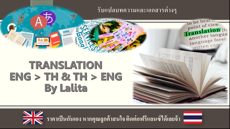รับแปลบทความและเอกสารประเภทต่างๆ ราคาเริ่มต้นที่ 250 บาท ต่อ 1 หน้า *คุณลูกค้าสามารถทักมาสอบถามรายละเอียดได้ ไม่ใช้บริการก็ไม่เป็นไรค่ะ ขอบคุณค่ะ รายละเอียดราคาเพิ่มเติม ในกรณีที่เป็นงานด่วน ต้องการให้เสร็จภายใน 1 วัน จะมีค่าบริการเพิ่มตามความเหมาะสมของงาน ขั้นตอนการทำงาน 1. ลูกค้าแจ้งรายละเอียดของงาน 2. ฟรีแลนซ์เสนอราคาให้ลูกค้า พร้อมแจ้งโค้ดส่วนลด (ถ้ามี) 3. ลูกค้าชำระเงินเข้าระบบ 4. รอระบบตรวจสอบยอดเงิน (กรณีโอนเงิน) 5. ฟรีแลนซ์เริ่มทำงาน 6. ส่งงานให้ลูกค้าตรวจสอบรายละเอียด 7. แก้ไข (กรณีที่มีข้อผิดพลาด) ฟรีแลนซ์ส่งงานขั้นสุดท้าย