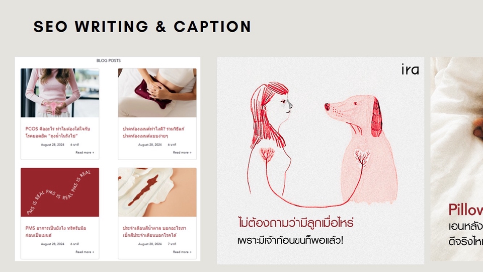 - เขียนบทความ SEO / Copywriting สำหรับเว็บไซต์และบล็อก - คิดและเขียนแคปชันสำหรับ Facebook, Instagram, TikTok, X และแพลตฟอร์มอื่น ๆ - เขียนสคริปต์วิดีโอ และ Storyboard สำหรับคอนเทนต์วิดีโอ - วางแผน Photo Album บรีฟ และออกแบบเนื้อหาภาพร่วมกับทีมกราฟิก