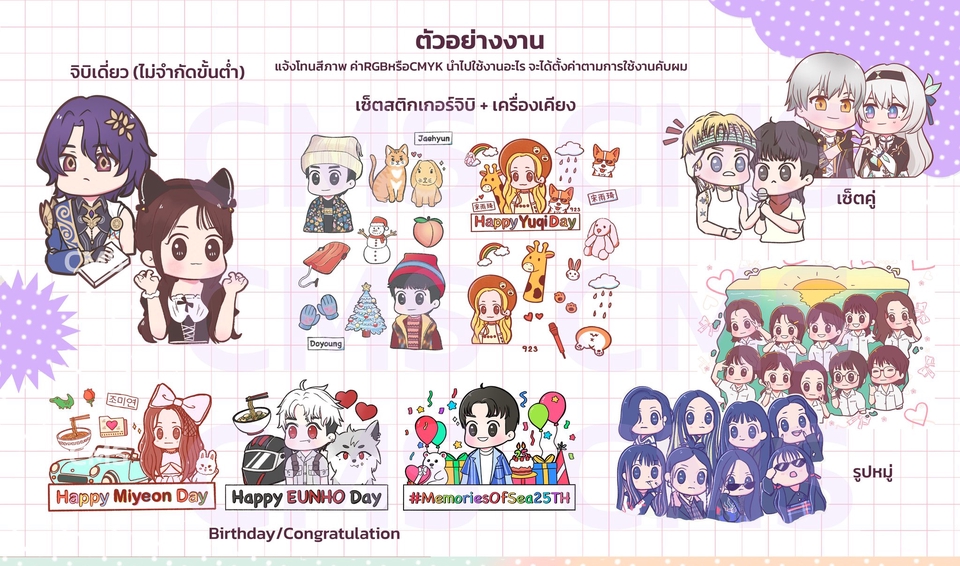 รับวาดจิบิ สำหรับ งานแฟนอาร์ต ทำโลโก้ ของแจก เชิงพาณิชย์ ขั้นตอนการทำงานกับเรา 1. จุดประสงค์ของงานที่จะนำไปใช้ ต้องการงานจิบิสัดส่วนแบบใด (ครึ่งตัว(สไตล์ที่วาดเป็น 3headsครึ่งตัว สามารถแจ้งได้หากต้องการให้ขนาดตัวเล็กลงแบบ 2heads) หรือเต็มตัวแบบ 2heads หรือ 3 heads) หรือเป็นภาพสัตว์ สิ่งของที่ต้องการ 2. บรีฟภาพท่าทาง(ref) โทนสี เลือกบรัชและสไตล์ของดวงตา (มีให้เลือกสองแบบตามที่เรากำหนด) สีพื้นหลัง ข้อความ 3. ไฟล์ภาพที่ต้องการ .png .jpg .psd 4. เสนอราคาและข้อตกลง 5. ส่งภาพเส้นก่อนลงสี แก้ไขได้ 1 ครั้ง ก่อนลงสี 6. ส่งงานภาพลงสี แก้ไขได้ 1 ครั้ง ก่อนส่งงาน 7. เตรียมส่งไฟล์ภาพ .png .jpg หากเป็น .psd มีค่าใช้จ่ายเพิ่มเติม ขั้นตอนการทำงาน 1. จุดประสงค์ของงานที่จะนำไปใช้ ต้องการงานจิบิสัดส่วนแบบใด (ครึ่งตัว(สไตล์ที่วาดเป็น 3headsครึ่งตัว สามารถแจ้งได้หากต้องการให้ขนาดตัวเล็กลงแบบ 2heads) หรือเต็มตัวแบบ 2heads หรือ 3 heads) หรือเป็นภาพสัตว์ สิ่งของที่ต้องการ 2. บรีฟภาพท่าทาง(ref) โทนสี เลือกบรัชและสไตล์ของดวงตา (มีให้เลือกสองแบบตามที่เรากำหนด) สีพื้นหลัง ข้อความ (ถ้ามี) 3. ไฟล์ภาพที่ต้องการ .png .jpg .psd 4. เสนอราคาและข้อตกลง 5. ส่งภาพเส้นก่อนลงสี แก้ไขได้ 1 ครั้ง ก่อนลงสี 6. ส่งงานภาพลงสี แก้ไขได้ 1 ครั้ง ก่อนส่งงาน 7. เตรียมส่งไฟล์ภาพ .png .jpg (หากเป็น .psd มีค่าใช้จ่ายเพิ่มเติม)