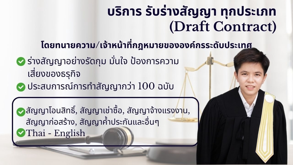 ✨บริการร่างสัญญาอย่างมืออาชีพ โดยเจ้าหน้าที่กฎหมายธุรกิจจาก สถาบันเทคโนโลยีป้องกันประเทศ DTI พร้อมประสบการณ์ตรงจากการทำงานให้กับเครือ CP ALL, CPRAM, TRUE, PIM จุดเด่นของบริการ 📌 ประสบการณ์ร่างและตรวจสัญญามากกว่า 100 ฉบับ (ไทย-อังกฤษ) 📌 ครอบคลุมทุกประเภทสัญญา เช่น - สัญญาโอนสิทธิ์ / เช่า-เช่าซื้อ / ค้ำประกัน / กู้ยืมเงิน - สัญญาจ้างแรงงาน / จ้างทำของ / บริการ - สัญญาจัดซื้อจัดจ้าง / ก่อสร้าง - ข้อตกลงความร่วมมือ (MOU) 📌 ร่างสัญญาแบบ “รัดกุม + ป้องกันความเสี่ยงธุรกิจ” 📌 จัดส่งงานตรงเวลา พร้อมบริการแก้ไขตามแพ็กเกจ ⚙️ Process การทำงาน 1️⃣ ลูกค้าอธิบายวัตถุประสงค์ เงื่อนไข และข้อมูลสำคัญ 2️⃣ วิเคราะห์และออกแบบโครงสร้างสัญญาที่เหมาะสม 3️⃣ จัดทำร่างสัญญา (Draft 1) 4️⃣ ลูกค้าตรวจสอบ + ขอแก้ไข (ตามแพ็กเกจ) 5️⃣ ส่งมอบไฟล์ Word / PDF ที่พร้อมใช้งานจริง