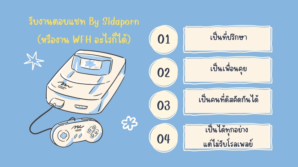 ตอบแชท เพื่อนคุย ฟังอย่างตั้งใจ นักให้กำลังใจ ดิสคัดได้ สะดวกงาน WFH หรืองานอื่นๆลองเสนอมาได้ค่ะ