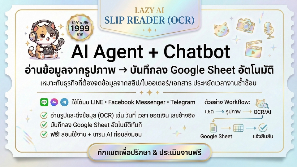 AI Agent + Chatbot สำหรับอ่านข้อมูลจากรูปภาพ และบันทึกลง Google Sheet โดยอัตโนมัติ ประหยัดเวลาทำงานซ้ำซ้อน เหมาะสำหรับธุรกิจที่ต้องจดข้อมูลจากสลิป, ใบออเดอร์ หรือเอกสารต่าง ๆ สามารถใช้งานได้ทั้งบน LINE, Facebook Messenger และ Telegram --- 📌 จุดเด่นของระบบ - อ่านรูปภาพและดึงข้อมูล (OCR) เช่น สลิปโอนเงิน, ใบสั่งยา, ใบออเดอร์, ใบเสร็จร้านค้า - ระบบจะบันทึกข้อมูลอัตโนมัติลง Google Sheet เช่น วันที่, เวลา, ยอดเงิน, หมายเลขอ้างอิง - ฟรี! สอนการใช้งานและสอนเทรน AI ก่อนส่งมอบงาน --- 💡 ตัวอย่างการใช้งานจริงจากประสบการณ์จริง 1. ร้านนวด & สปา ลูกค้าส่งรูปสลิปผ่าน LINE → AI อ่านยอดเงิน/เวลา → ข้อมูลขึ้น Google Sheet ทันที พร้อมข้อความยืนยันการชำระ 2. ร้านอาหาร / เดลิเวอรี่ ถ่ายรูปใบออเดอร์ → ระบบอ่านชื่อเมนู, จำนวน, ราคา → บันทึกเข้า Sheet 3. คลินิกหรือร้านขายยา อัปโหลดใบสั่งยา → ระบบอ่านชื่อยา / ปริมาณ / เวลาใช้ยา → จัดเก็บเป็นฐานข้อมูลผู้ป่วย --- 🧭 ขั้นตอนการทำงาน 1. พูดคุยรายละเอียดของงานและขอบเขตโปรเจกต์ 2. ออกแบบ workflow + สาธิตการทำงานเบื้องต้น 3. สอนใช้งานระบบก่อนส่งมอบ 4. ส่งมอบระบบพร้อม workflow ที่ใช้งานได้จริง --- พร้อมให้คำปรึกษาและออกแบบระบบให้เหมาะกับธุรกิจของคุณ 💬 เหมาะสำหรับผู้ประกอบการ SME และร้านค้าขนาดเล็กที่อยากเริ่มใช้ AI Automation โดยไม่ต้องมีพื้นฐานเทคนิค --- ค่าใช้จ่ายเพิ่มเติม 1. ค่าใช้จ่ายการ Run software บน cloud ประมาณเดือนละ 700 บาท 2. ค่าใช้จ่ายการเรียกใช้งาน LLMs ตามจำนวนการใช้งานจริง **จากการทดลองใช้งานจริงถูกกว่าการจ้างพนักงานรายเดือนและช่วยประหยัดเวลาได้**