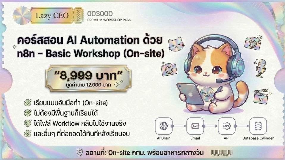 คอร์สสอน AI Automation ด้วย n8n – Basic Workshop (On-site) เรียนรู้การสร้าง Workflow ตั้งแต่ 0 จนใช้งานได้จริง พร้อมโค้ชดูแลตลอดคลาส คลาสนึงประมาณ 6-10 คน เพื่อที่จะดูแลได้ทั่วถึง หากคุณสนใจการใช้ AI เพื่อช่วยงานแบบอัตโนมัติ หรืออยากเริ่มต้นสร้างระบบอัจฉริยะด้วยตัวเอง คอร์สนี้เหมาะสำหรับคุณ! 🧠 สิ่งที่จะได้เรียนรู้ในคอร์ส: ✅ ปูพื้นฐานการใช้ n8n เพื่อสร้าง AI Workflow แบบเข้าใจง่าย ✅ สอนเชื่อมต่อ API ภายนอก พร้อมตั้งค่า Credential เพื่อเชื่อมกับแอปต่างๆ ✅ สร้าง AI Workflow แบบ Agentic ที่สามารถทำงานได้หลายขั้นตอนโดยอัตโนมัติ ✅ ตัวอย่าง Workflow ที่จะได้ลงมือทำจริง เช่น: AI เลขาส่วนตัว: จัดการอีเมล สรุปข้อมูล หรือช่วยเขียนคอนเทนต์ RAG Workflow: ดึงข้อมูลจาก Vector Database มาใช้งานในการตอบสิ่งที่ลูกค้าถาม เหมาะสำหรับข้อมูลเยอะๆหรือดาต้าเบสการสต๊อคของร้านขายของใหญ่ๆ และอื่นๆ ที่ต่อยอดได้ทันทีหลังเรียนจบ 🎯 จุดเด่นของคอร์สนี้ ✔️ เรียนแบบจับมือทำ (On-site) ✔️ ไม่ต้องมีพื้นฐานก็เรียนได้ ✔️ ได้ไฟล์ Workflow กลับไปใช้งานจริง ✔️ มีโค้ชดูแลทุกขั้นตอน ขั้นตอนการทำงาน 1. สอน Basic เริ่มต้นจากพื้นฐาน 2. เพิ่ม Node และอธิบายการทำงานของแต่ละ Node เข้าไปเรื่อยๆ