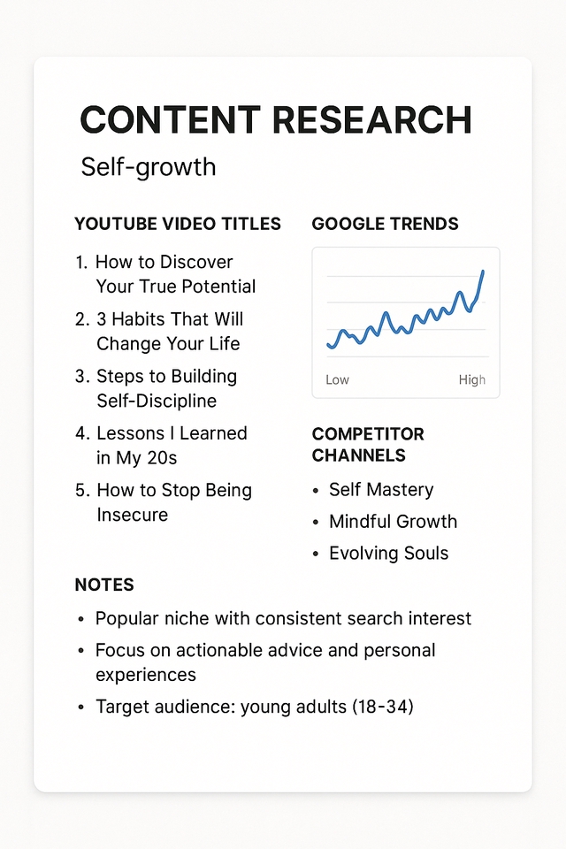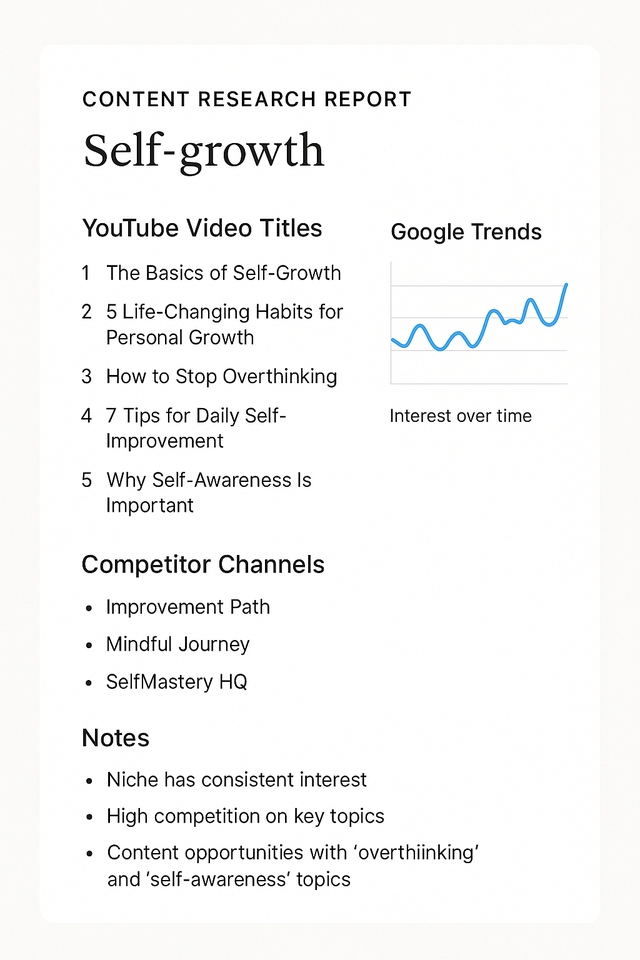 I help creators and businesses research viral content ideas and trending topics across YouTube, Instagram, and blogs. My service includes: ✅ YouTube content ideas with titles ✅ Instagram reel/post concepts ✅ Blog topics with SEO keywords ✅ Competitor & niche analysis ✅ Monthly content calendar (if needed) ✅ Tools used: ChatGPT, Notion, Google Trends Whether you're just starting or stuck in a content rut, I’ll provide research that helps you plan smarter and grow faster. ขั้นตอนการทำงาน 1. Requirement Gathering I discuss your niche, target audience, and content goals to understand exactly what type of research you need. 2. Research & Analysis I perform thorough research on trends, keywords, competitors, and content gaps using tools like Google Trends, ChatGPT, and Notion. 3. Content Ideas & Report Creation I compile the research into a clear report with trending video/blog titles, competitor insights, and strategy notes. 4. Delivery & Revisions I deliver the report within the agreed timeframe and offer revisions if needed to ensure it fits your needs perfectly.