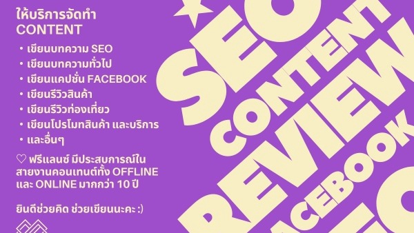 ✅ สามารถเขียนได้หลากหลายแนว (จิตวิทยา, ท่องเที่ยว,ไลฟ์สไตล์,สุขภาพ,อาหาร,อสังหาฯ, eCommerce ฯลฯ) ✅ มีประสบการณ์ตรง ทั้งด้านจิตวิทยา, ท่องเที่ยว, อสังหาฯ และ eCommerce 💜 ตัวอย่างผลงานเขียน SEO : https://www.diyinspirenow.com https://www.dotproperty.co.th/blog https://www.pueasukkapab.com ——————————— ・รีวิวลงพื้นที่จริง 1 หน้า A4 เริ่มต้นที่ 8,000 บาท (ไม่รวมค่าเดินทาง) 💜 ตัวอย่างงานรีวิว ท่องเที่ยว, ธุรกิจ : www.diylifestyleblogs.com ——————————— :: ประสบการณ์ทำงาน 10 ปี+ :: 💜 Columnist, Editor, Content Manager, Freelance Writer, Content Specialist ให้กับบริษัทชั้นนำ 💜 แมกกาซีน (DACO, Tamago, anywhere, Postcard) 💜 โทรทัศน์ (อาเซียนโฟกัส, วาบิซาบิ, Sugoi Japan) 💜 เว็บไซต์ (WabisabiTV,TrueID, Sanook, MushroomTravel, DotProperty, Forbest Properties, Japan List, ShopBack, DIYINSPIRENOW, Pueasukkapab) 💜 Portfolio บางส่วน และบล็อกส่วนตัว www.diylifestyleblogs.com ขั้นตอนการทำงาน 1. พูดคุยเกี่ยวกับลักษณะงานที่อยากได้ 2. ขอข้อมูลจากลูกค้าเพื่อมาใช้ในการวางแผน และผลิตชิ้นงาน 3. ส่งงานคุณภาพตามกำหนดเวลา (สามารถแก้ไขได้ 1 ครั้ง ตามตกลงก่อนเริ่มงาน)