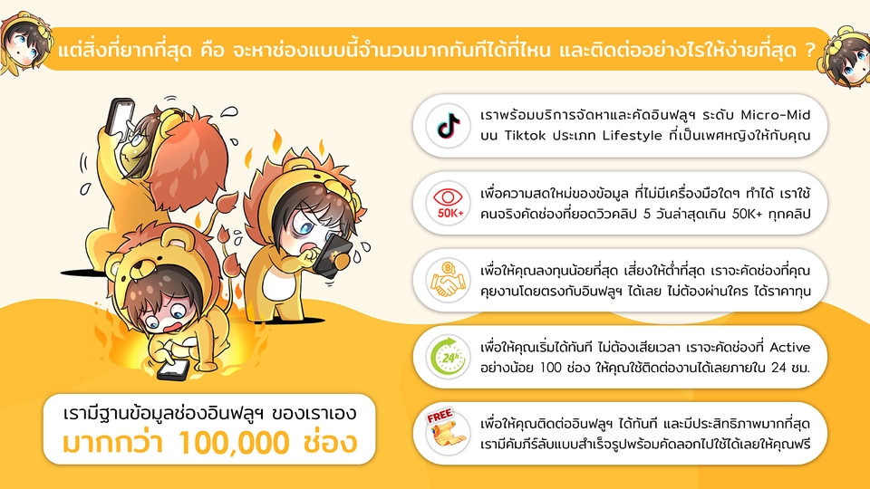 LION Entertainment มีฐานข้อมูล Influencer บน Tiktok ของตัวเองมากกว่า 100,000 ช่อง พร้อมจัดหาและคัดเลือกให้คุณได้ทันทีภายใน 24 ชม.
