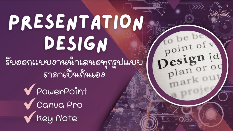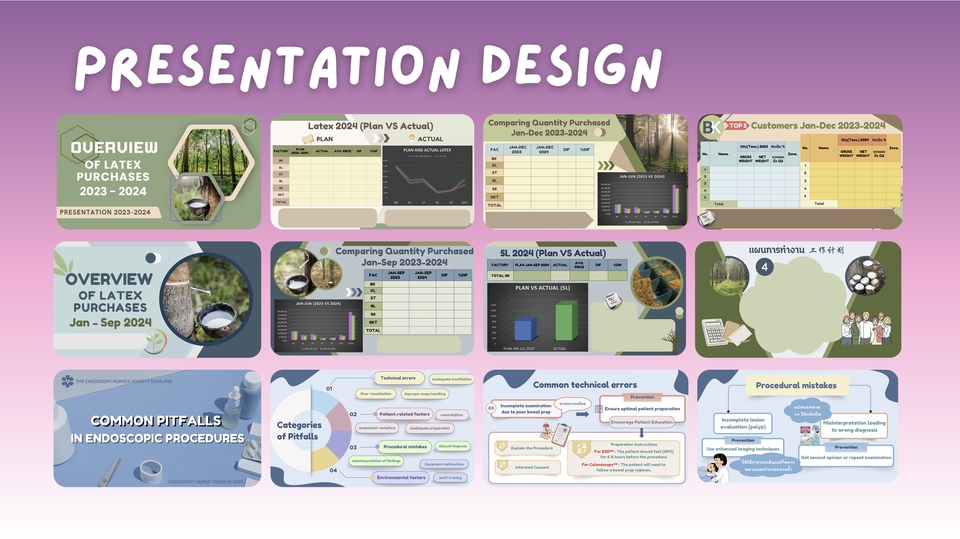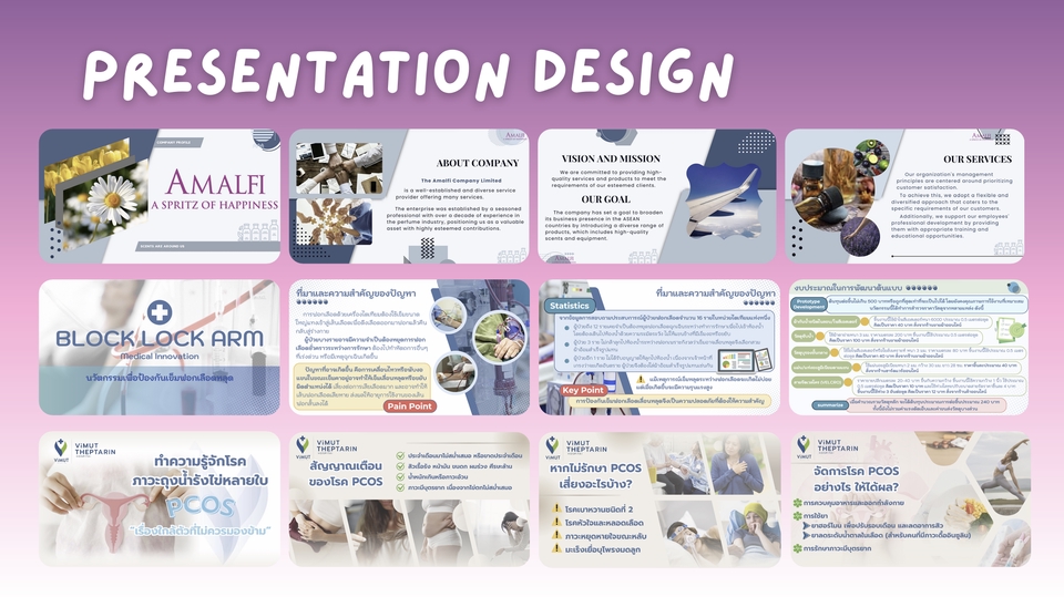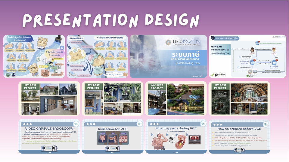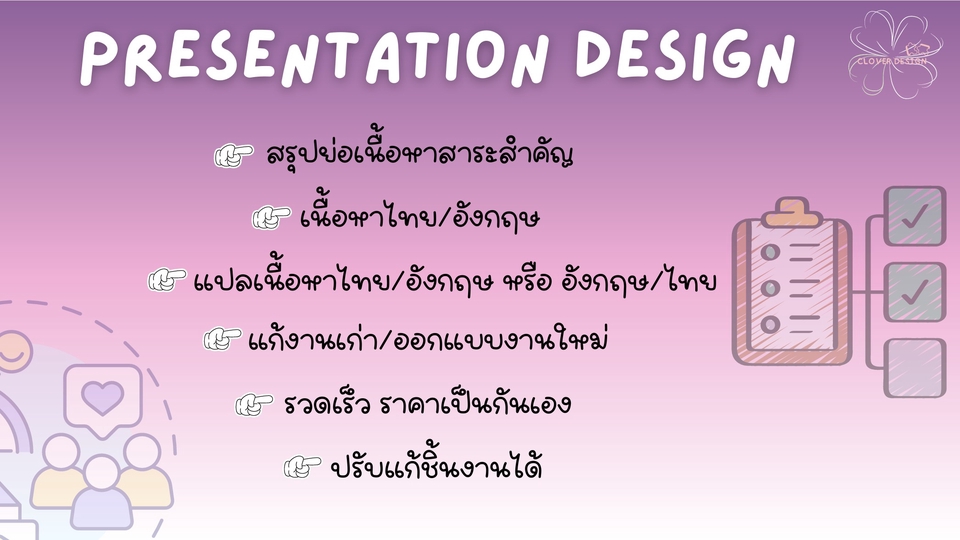 สนใจเกี่ยวกับงานออกแบบ มีประสบการณ์เกี่ยวกับงานเขียนบทความและงานออกแบบมามากกว่า 5ปี ออกแบบงานนำเสนอได้หลากหลายตามโจทย์ลูกค้า รวดเร็ว แก้ไขงานได้ ราคาเป็นกันเอง ขั้นตอนการทำงาน 1. ส่งไฟล์เนื้อหาข้อมูลมาให้วิเคราะห์และประเมินจำนวนหน้า 2. ตกลงราคาและส่งใบเสนอราคา 3. เริ่มรับงานตามระยะเวลาที่กำหนด 4. ส่งให้ตรวจสอบครั้งที่ 1-2 แล้วแต่แพคเกจ 5. ส่งงานครั้งสุดท้าย จบงาน