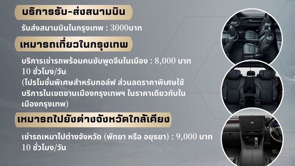 บริการเช่ารถพร้อมคนขับรถพูดภาษาจีนได้ 🚐✨ บริการเช่ารถ Alphard พร้อมคนขับที่พูดภาษาจีนได้ Vvip ✨ รถใหม่ บริการระดับพรีเมียม เหมาะสำหรับรับส่งสนามบิน เที่ยวในกรุงเทพ ,พัทยา ,หัวหิน ,เขาใหญ่ หรือเดินทางต่างจังหวัดใกล้เคียง ✅ราคาเป็นกันเอง ✅ คนขับสุภาพ มีประสบการณ์ พูดจีนได้ ✅ เหมาะกับนักท่องเที่ยว ครอบครัว หรือทริปทำงาน