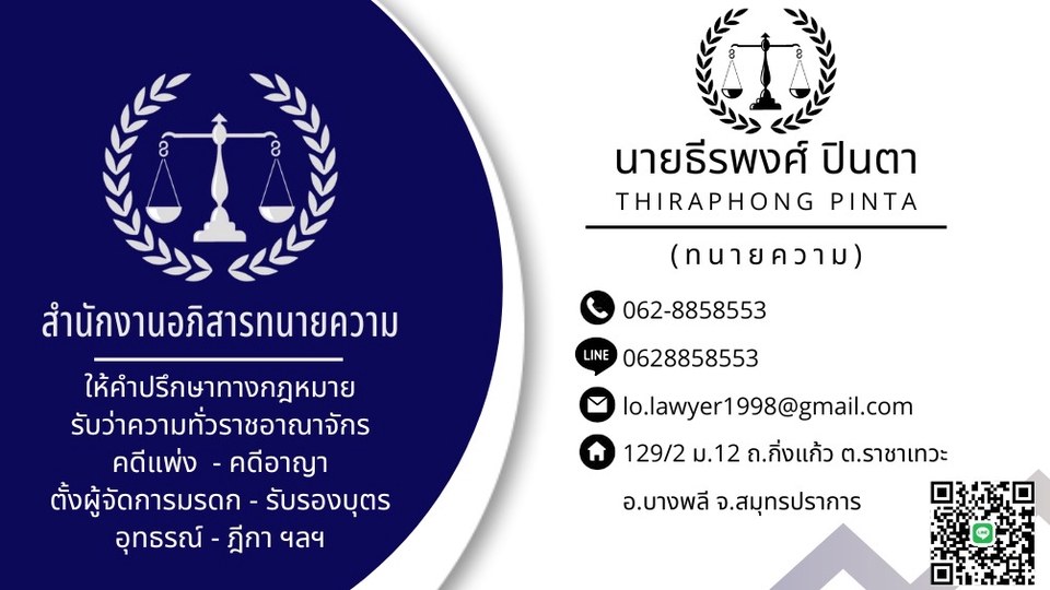 ให้คำปรึกษาทางกฎหมาย รับว่าความทั่วราชอาณาจักร คดีแพ่ง - คดีอาญา - ตั้งผู้จัดการมรดก - รับรองบุตร - อุทธรณ์ - ฎีกา ฯลฯ