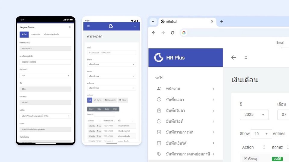 1. sync ตารางงาน zk api 2. sync เวลาเข้า-ออก zk api 3. บันทึกใบลา 4. คำนวณ ot จากการ sync เวลาเข้า-ออก อัตโนมัติ 5. บันทึกเงินได้ 6. บันทึกรายการหัก 7. กำหนดวันหยุดประจำปี 8. บันทึกเงินเดือน 9. Export สลิปเงินเดือน 10. Export file สำหรับนำส่งประกันสังคม 11. คำนวณภาษีเงินได้ของพนักงานแต่ละเดือน 12. Export file สำหรับนำส่งภาษีหัก ณ ที่จ่ายของพนักงานประจำเดือน 13. กำหนดสิทธิการเข้าใช้งาน
