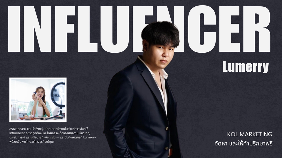 ในยุคที่ตลาดเต็มไปด้วยการแข่งขัน การมี KOL ที่เหมาะสมคือกุญแจสำคัญที่ช่วยเปิดการมองเห็น สร้างความน่าเชื่อถือ และเพิ่มยอดขายให้กับแบรนด์อย่างมีประสิทธิภาพ เราเข้าใจอย่างลึกซึ้งถึงพฤติกรรมผู้บริโภคและกลุ่มเป้าหมายในแต่ละตลาด พร้อมเครือข่าย KOL คุณภาพจากหลากหลายวงการ ที่สามารถตอบโจทย์ความต้องการของแบรนด์คุณได้อย่างแม่นยำ ทำไมต้องเลือกเรา? ประสบการณ์ตรงในการคัดสรรและบริหารจัดการ KOL ที่เหมาะสมกับภาพลักษณ์และกลุ่มเป้าหมายของคุณ วางกลยุทธ์แคมเปญที่เน้นผลลัพธ์จริง ช่วยเพิ่มยอดขายและการรับรู้แบรนด์อย่างยั่งยืน บริหารงานอย่างมืออาชีพ ตั้งแต่การเจรจา ควบคุมคุณภาพงาน ไปจนถึงการวัดผลลัพธ์ พร้อมให้คำปรึกษาและดูแลอย่างใกล้ชิดตลอดโครงการ ด้วยทีมงานมืออาชีพและความมุ่งมั่น เราพร้อมเป็นพาร์ทเนอร์ที่ช่วยผลักดันธุรกิจของคุณให้เติบโตอย่างมั่นคง และสร้างความเชื่อมั่นในใจลูกค้าอย่างแท้จริง ติดต่อเราทีม Lumerry เพื่อเริ่มต้นแผนการตลาดที่ใช่ และก้าวสู่ความสำเร็จไปด้วยกัน!