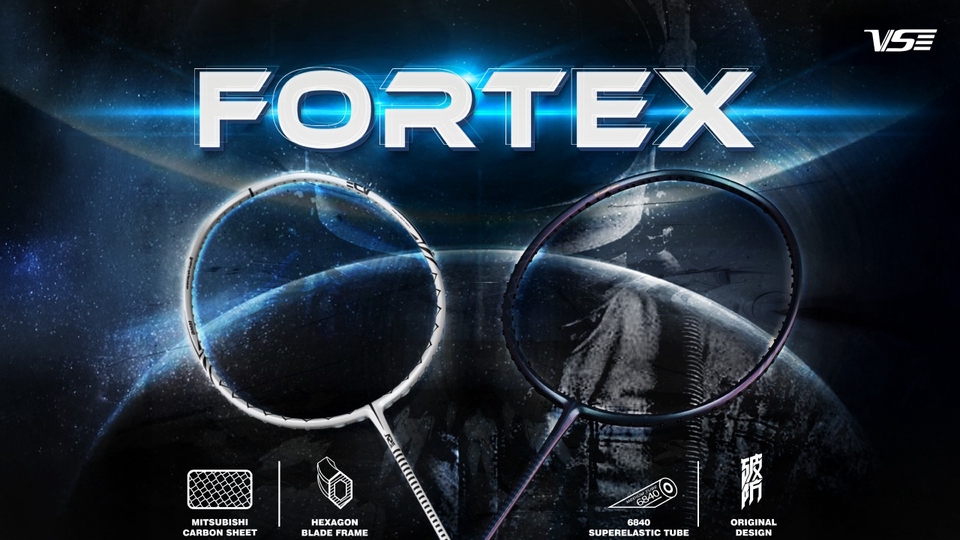 "Fortex" horizontal poster art with the concept of a badminton racket breaking through the defense. It comes in a space theme that combines modern technology.