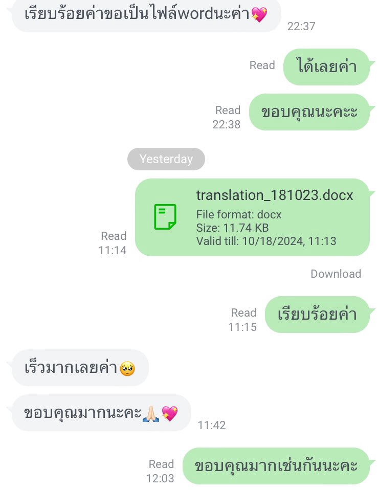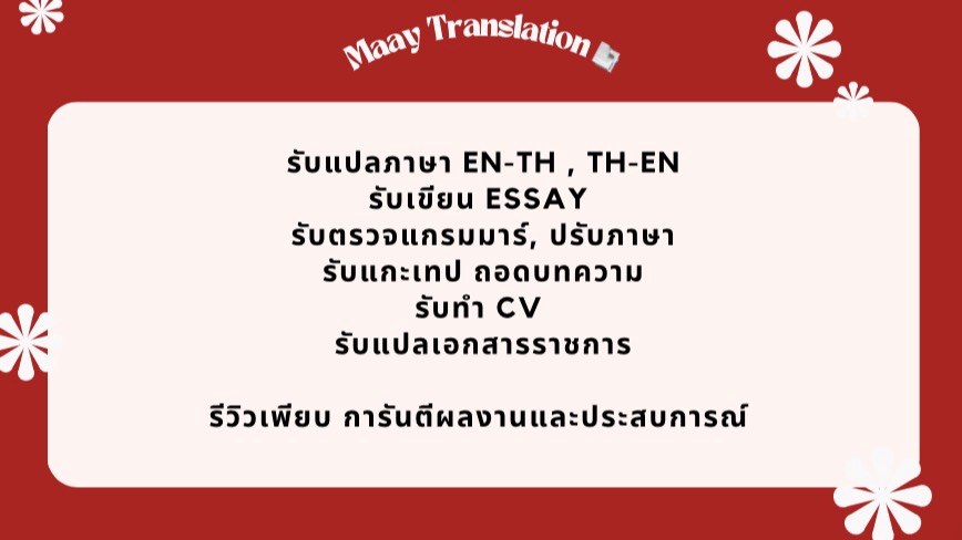 สวัสดีค่ะ! รับแปลงานเอกสารทุกรูปแบบ ไทย - อังกฤษ, อังกฤษ - ไทย 🇹🇭🇺🇸 สนใจสอบถามรายละเอียดเพิ่มเติมได้เลยค่ะ :-) Hello I'm Maay. a professional freelance translator with over 5 years of experience. Fluent in English and Thai. I specialize in accurate and culturally nuanced translations for various industries, including legal, marketing, technical, and literary.