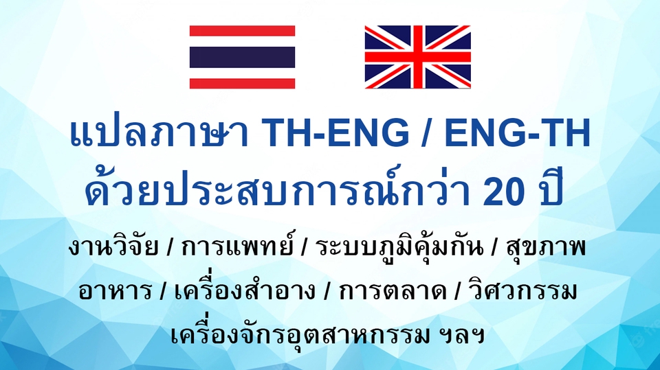 บริการแปลภาษาอังกฤษ-ไทย และ ไทย-อังกฤษ ด้วยประสบการณ์ด้านงานแปลกว่า 20 ปี มีผลงานแปลด้านงานวิจัย การแพทย์ ระบบภูมิคุ้มกัน สุขภาพ อาหาร เครื่องสำอาง การตลาด วิศวกรรม เครื่องจักรอุตสาหกรรม เป็นต้น