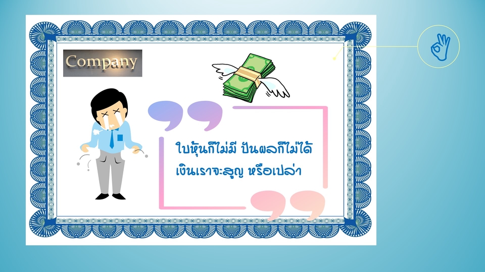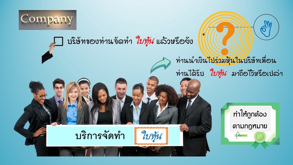 ท่านเจ้าของบริษัท Startup ทีจัดตั้งบริษัทมาแล้ว ไม่เคยทราบ และผู้ดำเนินการจดทะเบียนให้ก็ไม่ได้บอก ตามกฎหมาย ทุกบริษัท (โดยกรรมการ) มีหน้าที่ต้องจัดทำ ใบหุ้น ให้แก่ผู้ถือหุ้นทุกคน พร้อมทั้งบันทึกรายการหุ้น หากไม่มี ต้องระวางโทษปรับ 1-2 หมื่นบาท ลงในสมุดทะเบียนผู้ถือหุ้นด้วย ท่านลองคิดดู หากท่านนำเงินไปร่วมหุ้นลงทุนในบริษัทของเพื่อน แต่เพือนมิได้ให้อะไรเรามาไว้่เป็นหลักฐาน ปัญหาอะไรจะเกิดขึ้นในอนาคต เรา,,,,,,,ให้บริการจัดทำ ใบหุ้น และสมุดทะเบียนหุ้น ให้แก่บริษัทท่าน เพื่อให้ถูกต้องตามกฎหมาย และเพื่อความสบายใจแก่เพื่อนร่วมหุ้นที่ท่านชักชวนมาร่วมลงทุน หมายเหตุ....เป็นใบหุ้นสามัญ ชนิดระบุชื่อผู้ถือ มีข้อความถูกต้องตามกฎหมาย และบันทึกรายการหุ้นลงในสมุดทะเบียนผู้ถือหุ้น ประวัติการเปลี่ยนแปลงการโอนหุ้น ตั้งแต่บริษัทจัดตั้งถึงปัจจุบัน ขั้นตอนการทำงาน 1. Pre 0rder ขอสำเนาบัญชีรายชื่อผู้ถือหุ้น (แบบ บอจ.5) ทุกฉบับที่เคยมี จากผู้ว่าจ้าง 2. พิจารณาประเมินงานที่ต้องทำ กำหนดเวลาส่งงาน แล้วทำใบเสนอราคา 3. จัดส่งงานที่ทำเสร็จให้แก่ผู้ว่าจ้าง (ใบหุ้น, สมุดทะเบียนผู้ถือหุ้น) ไปยังที่อยู่ของผู้ว่าจ้าง