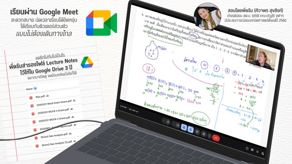- • เรียนคณิตออนไลน์แบบตัวต่อตัว (สด) ผ่าน Google Meet เป็นเวลา 1 ชั่วโมง