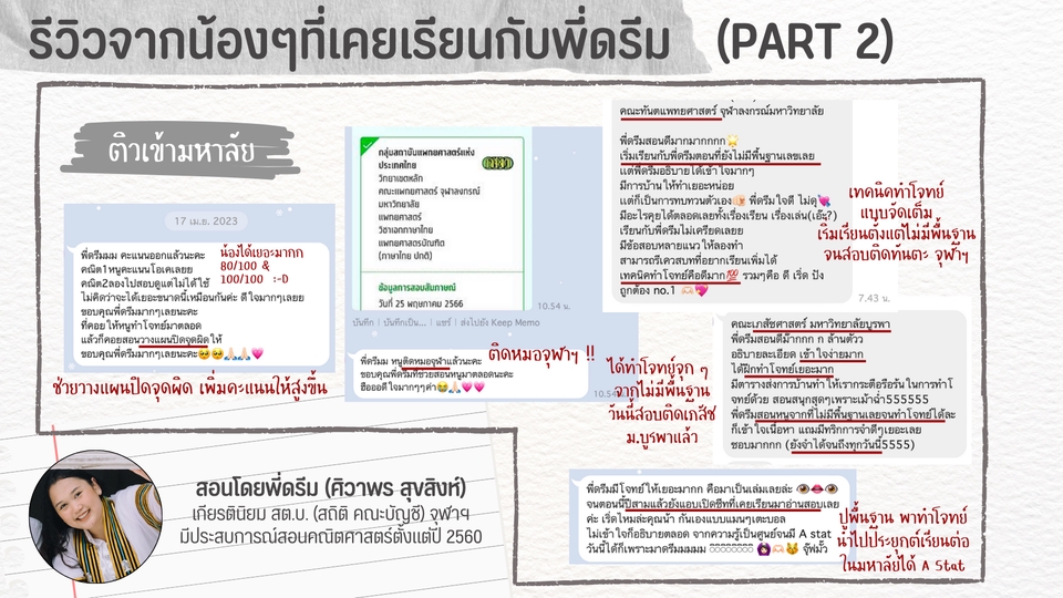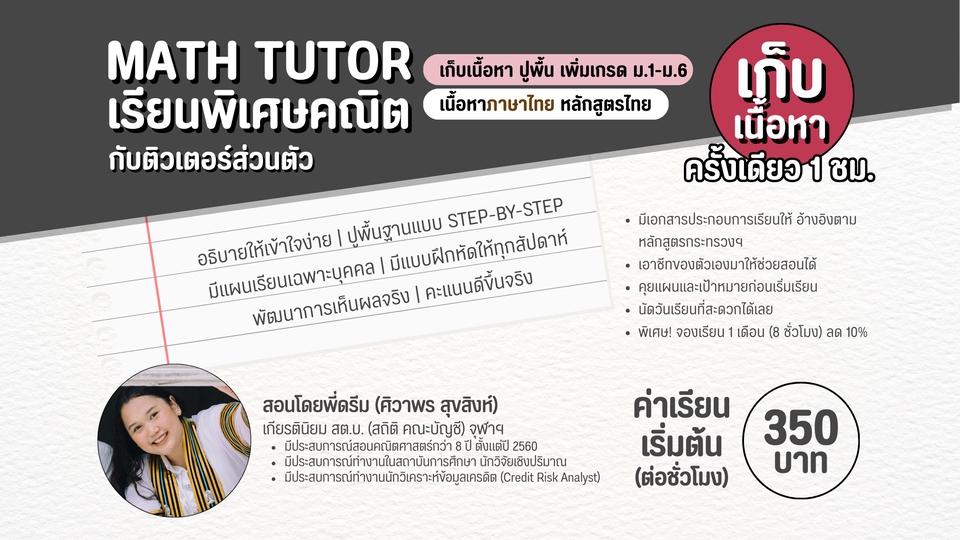 ✨ สำหรับน้อง ๆ ที่อยากเรียนเลขให้เข้าใจ อยากเลิกกลัวคณิตศาสตร์ อยากปูพื้นฐานให้แน่น ๆ จะได้เพิ่มแต้มต่อในการสอบต่าง ๆ คอร์สนี้เหมาะกับน้องมาก ๆ ค่ะ พี่จะพาเดินตั้งแต่สเตปที่น้องยืนอยู่ จนถึงจุดที่เข้าใจคณิต และมั่นใจในการสอบได้ เข้าใจโจทย์ รู้เทคนิค ทำได้แน่นอน 💪 🖍️ รายละเอียดงาน - รับสอนคณิตออนไลน์แบบตัวต่อตัว เพื่อปูพื้นฐาน เพิ่มเกรดในห้องเรียน และเก็บเนื้อหาให้พร้อมไปทำข้อสอบต่อ - เน้นปูพื้นฐานคณิตที่จำเป็นสำหรับการสอบ - อธิบายทีละขั้น ไม่เร่ง ไม่กดดัน น้อง ๆ สามารถถามได้ทุกข้อสงสัย - มีการคุยแผนและเป้าหมายร่วมกันก่อนเริ่มเรียน - เรียนสดผ่าน Google Meet - สามารถนัดวันและเวลาเรียนตามความสะดวก และจองเวลาเรียนด้วยตนเองผ่าน Google Calendar แพ็กเกจนี้เหมาะสำหรับน้องที่ตั้งใจเพื่อปูพื้นฐาน เพิ่มเกรดในห้องเรียน และเก็บเนื้อหาให้พร้อมไปทำข้อสอบต่อ อย่างจริงจัง ตลอดคอร์ส พี่จะพาน้องทำแบบฝึกหัด พร้อมสอนตั้งแต่ Step 0 โจทย์จะไล่ระดับจากง่ายไปยาก (รู้ตัวอีกทีก็เก่งเลขแบบไม่รู้ตัวซะแล้ว :-P) พร้อมช่วยปิดจุดอ่อน เติมจุดที่ยังไม่เข้าใจ และฝึกวิธีคิดให้เป็นระบบ โดยทั่วไปจะใช้เวลาประมาณบทละ 1-2 เดือนเพื่อเก็บเนื้อหา และไล่ทำแบบฝึกหัดจนสามารถนำไปสอบได้ แต่ถ้าน้องยังไม่มีพื้นฐานบทก่อนหน้ามาก่อน อาจมีการปูพื้นฐานก่อนเรียนบทนั้นเพิ่ม ซึ่งอาจใช้เวลาเพิ่มขึ้นนิดหน่อยค่ะ ยกตัวอย่างเช่น ถ้าน้อง ๆ ยังคูณหารไม่คล่อง จะสอนเรื่อง ค.ร.น ห.ร.ม ก็อาจจะยากใช่ไหมคะ ดังนั้นเราอาจจะย้อนไปเก็บเรื่องที่ขาดกันหน่อยถ้าจำเป็นค่ะ แพ็กเกจรายเดือนสามารถจองวันและเวลาเรียนประจำได้ มีการบ้านและแบบฝึกหัดให้ฝึกต่อเนื่อง ถ้าทำการบ้านและฝึกสม่ำเสมอตามแผน จะเห็นพัฒนาการชัด และจบได้ตามเวลาที่วางไว้ค่ะ 📓 ประสบการณ์และความเชี่ยวชาญ - ประสบการณ์สอนคณิตศาสตร์มากกว่า 8 ปี - จบการศึกษา สาขาสถิติ คณะพาณิชยศาสตร์และการบัญชี จุฬาลงกรณ์มหาวิทยาลัย - มีประสบการณ์สอนน้อง ๆ เพื่อปูพื้นฐาน เพิ่มเกรดในห้องเรียน และเก็บเนื้อหาให้พร้อมไปทำข้อสอบต่อไปจนถึงต่อยอดสอบติดโรงเรียน และคณะในฝันเลยค่ะ (ดูรีวิวได้เลยนะคะ) 📝 ขั้นตอนการทำงาน 1. พูดคุยเพื่อดูพื้นฐานและเป้าหมายการสอบ 2. วางแผนการเรียนให้เหมาะกับระดับและเวลาของน้อง 3. เริ่มเรียนและฝึกโจทย์ตามแนวข้อสอบ 4. ติดตามผลและปรับแผนการเรียนเป็นระยะ เพื่อประสิทธิภาพในการเรียนสูงสุด 🏷️ แพ็กเกจและสิทธิพิเศษ - เรียนรายครั้ง (1 ชั่วโมง) - แพ็กเกจรายเดือน (8 ชั่วโมง) รับส่วนลด 10% - แพ็กเกจรายเดือนสามารถจองวันและเวลาเรียนป