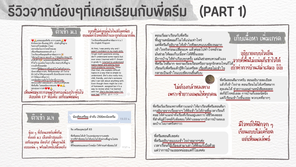 - • อธิบาย พาทำโจทย์ สอนการบ้าน ตามเนื้อหาขอโรงเรียน เพื่อให้น้อง ๆ มีเกรดคณิตตามเป้า