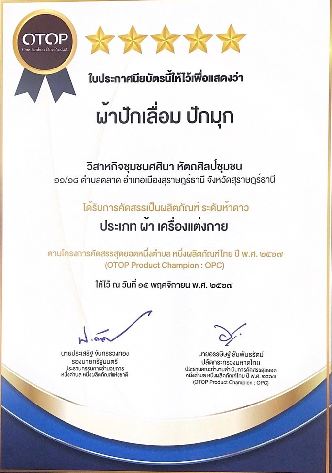 ศศินา หัตถศิลป์ชุมชน เป็นกลุ่มคนในชุมชนสหกรณ์ครูจังหวัดสุราษฎร์ธานีที่นำผ้า “ปาเต๊ะ” ผ้าพื้นเมืองมาเพ้นต์ลายและปักเลื่อม เพื่อความสวยงามและเพิ่มมูลค่า สร้างเป็นเอกลักษณ์ที่แตกต่างจากผ้าปาเต๊ะทั่วไป โดยจำหน่ายในรูปแบบผ้าผืนสำหรับตัดเย็บ และผ้านุ่ง เป็นงานหัตถศิลป์ที่ช่วยเสริมสร้างรายได้ให้แก่คนในชุมชน รายละเอียดงาน - โดยการนำผ้ามาวาดลวดลาย ตามที่ลูกค้าต้องการ แล้วทำการปักมุก เลื่อม ลูกปัด คริสตัล ฯลฯ ลงบนผ้า เป็นการปักด้วยมืออย่างวิจิตรบรรจง ความงดงามของผ้าปัก อยู่ที่การจินตนาการของผู้ปักแต่ละคน เมื่อปักเสร็จ จะมีเอกลักษณ์เฉพาะตัว หรือมีเพียงหนึ่งเดียวเท่านั้น ผ้าที่ปักแล้วจะมีความแวววาว โดดเด่น สวยงาม น่าสวมใส่มากยิ่งขึ้น อีกทั้งยังเป็นการสร้างรายได้ให้กับคนในชุมชน ทำให้มีความเป็นอยู่ที่ดีขึ้นอีกด้วย ประสบการณ์และความเชี่ยวชาญ - ผู้ปักมีประสบการณ์กว่า 20 ปี ด้านการปักผ้า ให้กับคุณหญิง คุณนายและผู้มีชื่อเสียงในจังหวัดสุราษฎร์ธานี - ได้รับมาตรฐานต่างๆ จากหน่วยงานรัฐ เช่น OTOP 5 ดาว, มาตรฐานผลิตภัณฑ์ชุมชน (มผช.) ฯลฯ ขั้นตอนการทำงาน - พูดคุยเพื่อเข้าใจความต้องการและรวบรวมข้อมูล - เริ่มงานและอัปเดตความคืบหน้าเป็นระยะ - ถ่ายรูปส่งงานให้ตรวจสอบและแก้ไข - ส่งมอบงาน สิ่งที่ต้องการจากผู้ว่าจ้าง - ข้อมูลและลวดลายของผ้าที่ต้องการโดยคร่าวๆ - ภาพถ่ายประกอบ ข้อกำหนดและเงื่อนไข - ไม่รับงานที่เกี่ยวข้องกับการพนันและสิ่งผิดกฎหมาย