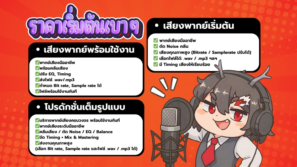 ฿1,500พากย์เสียงมืออาชีพ พร้อมคลีนเสียง ปรับ EQ, Timing ส่งไฟล์ .wav/.mp3 กำหนด Bit rate, Sample rate ได้ ไฟล์พร้อมใช้งานทันที