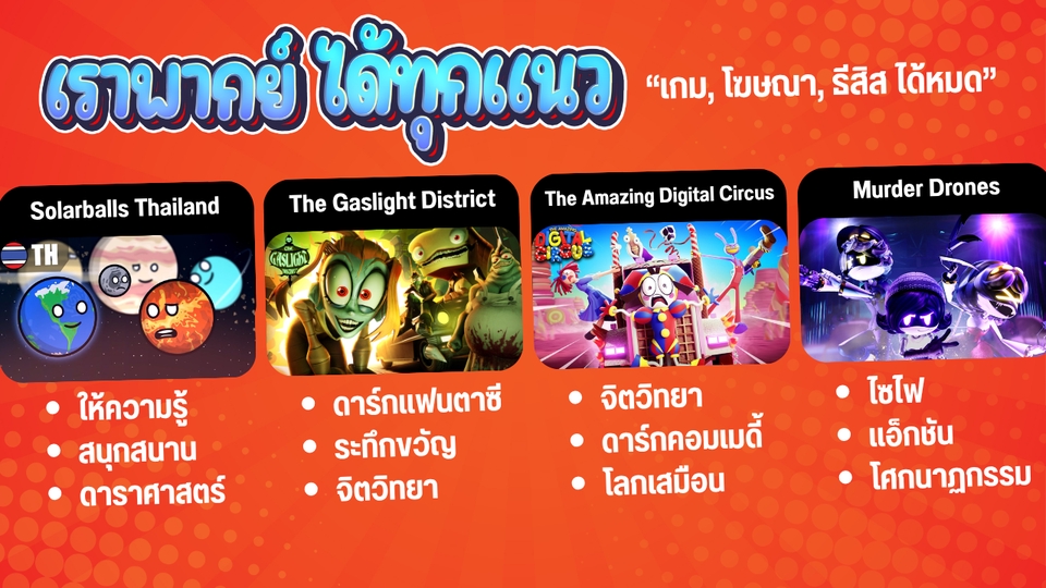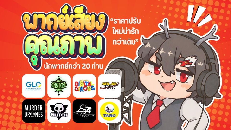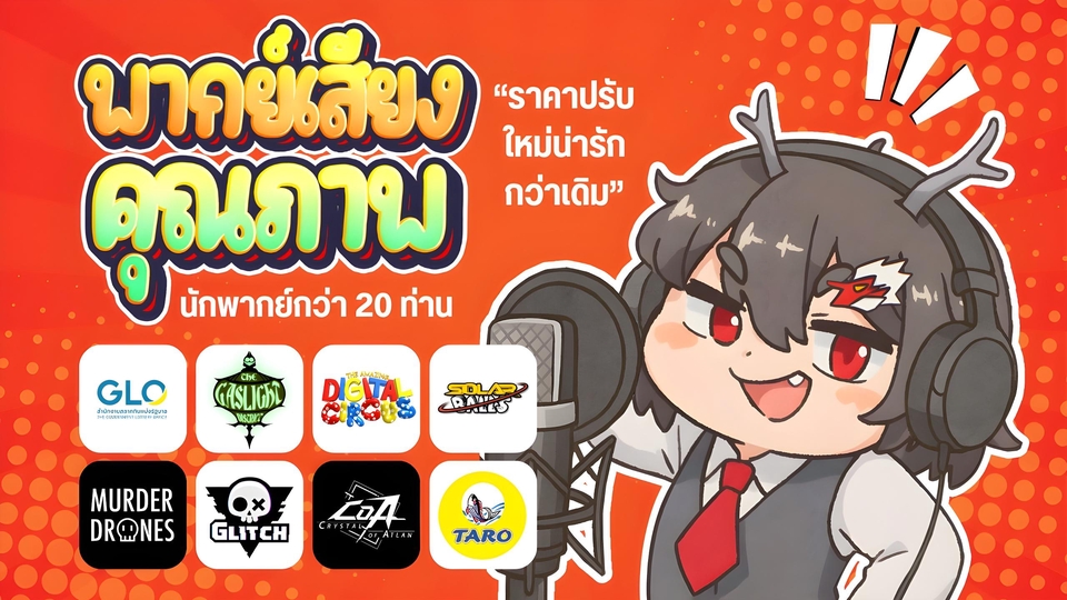 ทีมพากย์มืออาชีพ ด้วยประสบการณ์มากกว่า 5 ปีในวงการ ทีมของเรามีความเชี่ยวชาญด้านการพากย์เสียงสำหรับสื่อทุกรูปแบบพร้อมผลงานจากความร่วมมือกับองค์กรและบริษัทชั้นนำ ทั้งในภาครัฐและเอกชน ผลงานที่เคยร่วมงาน: - สำนักงานสลากกินแบ่งรัฐบาล (GLO) - โฆษณาเกม Crystal Atlan ผลงานพากย์อย่างเป็นทางการ (Official): - The Amazing Digital Circus - SolarBalls Thailand - Murder Drones - The Gaslight District