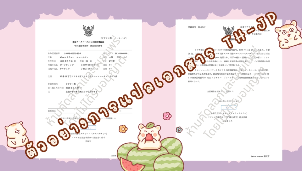 ⭕️ เอกสารทางการ เอกสารราชการ เอกสารส่วนตัว ⭕️ เพลง คลิปเสียง ซับไตเติ้ล บทความ เกม มังงะและนิยายทุกประเภท (โดจิน/แฟนฟิคก็รับค่ะ แต่อาจจะรับบางประเภท ลองสอบถามก่อนได้ค่ะ) ⭕️ อื่นๆ สามารถเข้ามาสอบถามก่อนได้ค่ะ ☺️ 🔴ประเมินราคาเป็นงานๆ นะคะ คิดตามประเภทและรายละเอียดของงาน🔴 ผู้แปลเรียนเอกญี่ปุ่นโดยตรงจากมหาวิทยาลัยธรรมศาสตร์ สอบวัดระดับได้ N2 ตั้งแต่อยู่ ม.6 ค่ะ (หลังเรียนญี่ปุ่นได้ปีครึ่ง) ปัจจุบันรับงานแปลฟรีแลนซ์กับบ. แปลภาษา และสนพ. งานประจำทำบัญชี/การเงินกับทีมญี่ปุ่น 🎯 งานไม่กี่หน้าก็รับค่ะ เข้ามาสอบถามก่อนได้ค่ะ 🎯 งานด่วน จะคิด x1.5 หรือ x1.25 จากราคาขึ้นอยู่กับความเร่งค่ะ 🎈ประสบการณ์ 🎈 - เอกสารกำหนดมาตราฐานของ Hitachi - เอกสารเกี่ยวกับสุขภาพของ Ajinomoto - เว็บไซต์บอทเทรดหุ้น TH>JP (https://aombot.com/ja/) - เว็บไซต์ boxasia TH>JP (https://boxasia.co.th/home-jp/) - เนื้อหา/บทสนทนาในเกมและโดจินชิ(แฟนฟิค) TH>JP - ซับไตเติ้ล TH>JP รายการท่องเที่ยวในช่อง ThaiPBS - แปลเกม TH > JP (https://www.youtube.com/watch?v=JjztsSVVVfU&t=248s) - กฎหมายสัญญา/หนังสือรับรองฯ/จดหมายเชิญ/บัญชีรายชื่อผู้ถือหุ้น - หนังสือชี้แจง/ใบแจ้งกรรมธรรม์/ใบรับรองแพทย์ - ทะเบียนสมรส/ทะเบียนบ้าน/ทะเบียนครอบครัว - ใบ certificate/transcript/passport - เคยเปิดเพจแปลฟรี ผู้ติดตาม 9100 คน - อื่นๆ 🔖ผลงานตีพิมพ์🔖 - Re:ZERO (Comic) บทที่ 3 Truth of Zero - รับคุณพี่เป็นแฟนไหมคะ? - ข้าคือขุนนางชั่วแห่งอาณาจักรดวงดาว - อื่นๆ ขั้นตอนการทำงาน 1. ลูกค้าทักข้อความ พร้อมแนบไฟล์งานที่ต้องการให้ประเมินราคา 2. ลูกค้าระบุรายละเอียดงานที่ต้องการ (เช่น การจัดหน้า วันเดดไลน์(หากมี) สกุลไฟล์ ฯลฯ) 3. ทางเราประเมินราคาและเวลาให้ลูกค้า พร้อมทวนรายละเอียดที่ลูกค้าต้องการ 4. หากลูกค้าตกลง จะเปิดใบเสนอราคา และดำเนินการแปลต่อไป 5. ส่งงานให้ลูกค้าตรวจทาน หากมีการแก้ จะแก้ไขและส่งให้ลูกค้าอีกครั้ง
