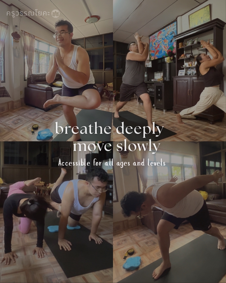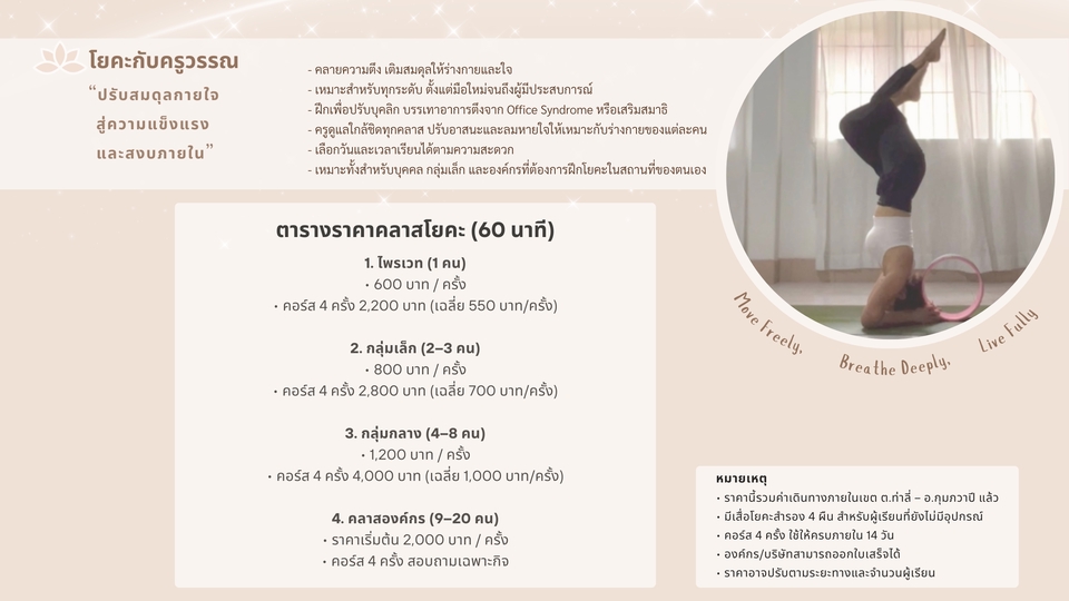 โยคะกับครูวรรณ 🧘♀️ “ปรับสมดุลกายใจ สู่ความแข็งแรงและสงบภายใน” Move Freely, Breathe Deeply & Live Fully RYT200 | Certified Yoga Teacher (RYS 200) ครูผู้เชี่ยวชาญด้านการฝึกโยคะอย่างลึกซึ้ง เน้นความปลอดภัยและความสงบในทุกการเคลื่อนไหว 📌 ภาษาที่ใช้สอน: ไทย / English 🇹🇭 🇺🇸 📍พื้นที่ให้บริการ: กุมภวาปี / โนนสะอาด / ศรีธาตุ / เมืองอุดรธานี 📍ทุกคลาสใช้เวลาสอน 60-75 นาที 🌼 ประเภทแพ็กเกจโยคะนอกสถานที่ (1) ไพรเวทคลาส 1:1 ✅ 600 บาท / ครั้ง ✅ 2,200 บาท / คอร์ส 4 ครั้ง (เฉลี่ย 550 บาท/ครั้ง) เหมาะสำหรับผู้ที่ต้องการการดูแลใกล้ชิดและปรับอาสนะเฉพาะบุคคล (2) คลาสกลุ่มเล็ก 2–3 คน ✅ 800 บาท / ครั้ง ✅ 2,800 บาท / คอร์ส 4 ครั้ง (เฉลี่ย 700 บาท/ครั้ง) เหมาะสำหรับเพื่อนหรือครอบครัวที่อยากฝึกโยคะร่วมกันในบรรยากาศส่วนตัวและอบอุ่น (3) คลาสกลุ่มกลาง 4–8 คน ✅ 1,200 บาท / ครั้ง ✅ 4,000 บาท / คอร์ส 4 ครั้ง (เฉลี่ย 1,000 บาท/ครั้ง) เหมาะสำหรับกลุ่มเล็กในชุมชนหรือองค์กรที่ต้องการเสริมสุขภาพและสร้างความสัมพันธ์ที่ดีร่วมกัน (4) คลาสองค์กร 9–20 คน ✅ ราคาเริ่มต้น 2,000 บาท / ครั้ง ✅ คอร์ส 4 ครั้ง (สอบถามรายละเอียดเพิ่มเติม) เหมาะสำหรับบริษัท โรงเรียน หรือหน่วยงานที่ต้องการจัดโปรแกรมโยคะเพื่อส่งเสริมสุขภาพและความผ่อนคลายให้พนักงาน 🌿 จุดเด่นของการเรียนโยคะกับครูวรรณ 1. เหมาะสำหรับทุกระดับ ทั้งผู้เริ่มต้น ผู้มีประสบการณ์ที่ต้องการพัฒนาทักษะต่อเนื่อง รวมถึงผู้สูงอายุ 2. ผู้เรียนสามารถกำหนดเป้าหมายได้ด้วยตนเอง ไม่ว่าจะเพื่อปรับบุคลิก ดูแลรูปร่าง บรรเทาอาการตึงจากออฟฟิศซินโดรม หรือบำบัด–ฟื้นฟูอาการปวดเมื่อย เพื่อสร้างสมดุลให้กายใจอย่างเป็นธรรมชาติ 3. ครูดูแลใกล้ชิดทุกคลาส โดยปรับท่า ลมหายใจ และระดับความเข้มข้นให้เหมาะกับร่างกายของแต่ละคน 4. เน้นการฝึกอย่างมีสติ ทีละขั้นตอน เพื่อให้ผู้เรียนเข้าใจร่างกายของตนเองได้ลึกซึ้งยิ่งขึ้น 5. คุ้มค่าทุกนาทีของการฝึก เพราะทุกคลาสคือ การดูแลด้วยความตั้งใจ 6. คลาสไพรเวทให้บรรยากาศสงบ ปลอดภัย เหมาะสำหรับผู้ที่ต้องการฝึกในพื้นที่ส่วนตัวโดยไม่ต้องเปรียบเทียบกับใคร 💫 สิ่งที่ลูกค้าจะได้รับ 1. เข้าใจร่างกายของตนเองมากขึ้น ผ่านการฝึกที่ผสานลมหายใจ การเคลื่อนไหว และการรับรู้ภายใน 2. เสริมสร้างความแข็งแรง ความยืดหยุ่น และลดอาการตึงล้าในร่างกาย 3. จิตใจสงบ ผ่อนคลาย และมีสมาธิดีขึ้น 4. ปรับสมดุลของร่างกายและบุคลิกภาพ เพิ่มความมั่นใจในตนเอง 5. รู้สึกสดชื่น มีพลัง และอารมณ์ดีหลังการฝึกทุกครั้ง 6. พัฒนาทักษะการฝึกต่อยอดได้ตามระดับและศักยภาพของแต่ละบุคคล 🌸 สิทธิพิเศษเฉพาะผู้เรียนต่อเนื่อง เพื่อผลลัพธ์ที่ยั่งยืน (คอร์สรายเดือนขึ