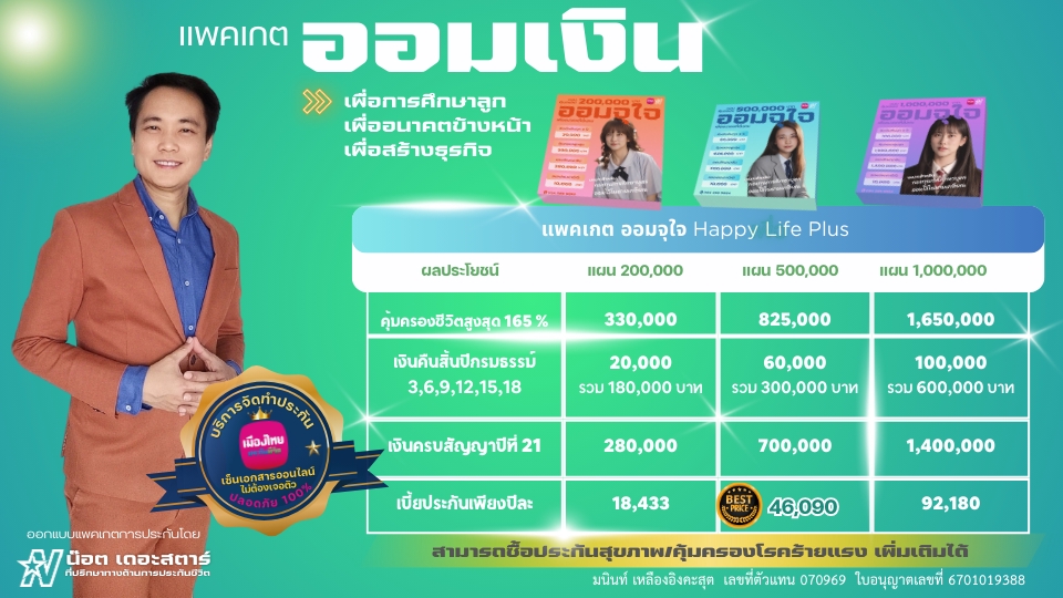 ฿898“ออมเงินอย่างมั่นคง เพื่ออนาคตที่มั่นใจ!” ✅ คุ้มครองชีวิตสูงสุด 165% ✅ รับเงินคืนทุกปี ตั้งแต่ปีที่ 3, 6, 9, 12, 15, 18 ✅ ครบสัญญารับเงินก้อนใหญ่ สูงสุด 1,400,000 บาท ✅ ออมง่าย ได้ทั้งเงินคืนและความคุ้มครอง “เริ่มต้นวันนี้ เพื่ออนาคตที่มั่นคงของคุณและครอบครัว