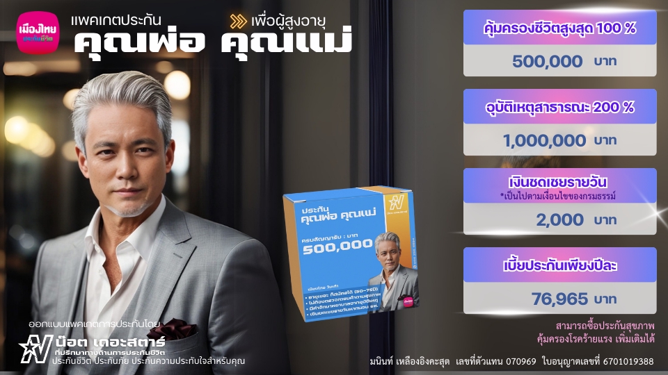 ฿798“ดูแลคุณพ่อคุณแม่ด้วยประกันที่คุ้มครองถึง 90 ปี!” ✅ คุ้มครองชีวิตสูงสุด 500,000 บาท ✅ อุบัติเหตุจ่ายเพิ่ม 2 เท่า! รับสูงสุด 1,000,000 บาท ✅ เงินชดเชยรายวัน สูงสุด 2,000 บาท ✅ ไม่ต้องตรวจสุขภาพ สมัครง่าย! “ให้ความมั่นคงกับคนที่คุณรัก วันนี้!”