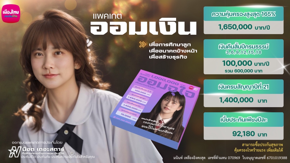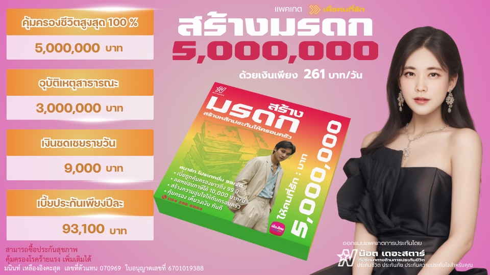 ฿698“แพ็กเกจสร้างมรดก เพื่อคนที่คุณรัก! ❤️” ✅ คุ้มครองชีวิตทันที 100% สูงสุด 10 ล้านบาท ✅ คุ้มครองอุบัติเหตุ 100% รับเพิ่มสูงสุด 3 ล้านบาท ✅ เบี้ยประกันเริ่มต้นเพียง 21,010 บาท/ปี ✅ เพิ่มความคุ้มครองสุขภาพ/โรคร้ายแรงได้ “ลงทุนเพียงหลักหมื่น ส่งต่อหลักล้าน!”