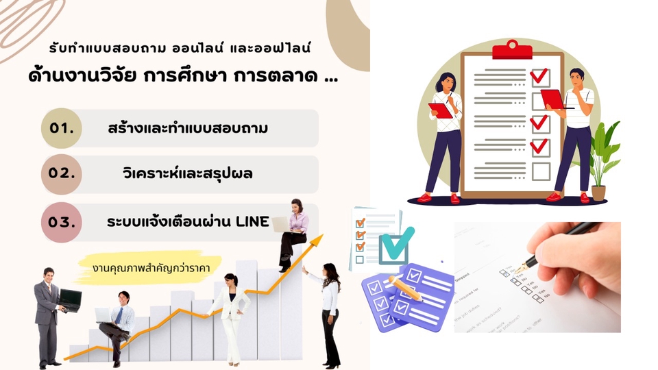 ประสบการณ์เรียนและการทำงาน - จบป.ตรีด้านคอมพิวเตอร์ และ ป.โท ด้านการจัดการเทคโนโลยีสารสนเทศ มีประสบการสอนนักศึกษา ระดับ ปวช. ปวส. ปริญญาตรี และ ป.บัณฑิต ในรายวิชาทางด้านคอมพิวเตอร์หรือเทคโนโลยีสารสนเทศ การจัดการเทคโนโลยีสารสนเทศ การตลาดดิจิทัล และประสบการณ์การเป็นผู้ประกอบการธุรกิจส่วนตัว - เป็นวิทยากรจัดอบรมให้ความรู้ด้านไอทีให้กับบุคลากรทางการศึกษา นักธุรกิจ และบุคคลทั่วไป รับงาน - สร้างแบบสอบถามทั้งออนไลน์และออฟไลน์ ลักษณะต่าง ๆ เช่น - แบบสำรวจความคิดเห็น - สำรวจความพึงพอใจ - แบบประเมินต่าง ๆ - แบบลงทะเบียนเก็บข้อมูล - แบบสำรวจวิจัย - แบบสำรวจด้านการตลาด - แบบทดสอบการเรียน - แบบวัดประเมินผล - ทำแบบฟอร์มแจ้งเตือนผ่านไลน์ หรืออื่น ๆ ตามที่ลูกค้าต้องการสามารถตกลงกันได้ โปรแกรมที่ใช้ Google Form , Google Sheet, MS-Excel , SPSS, MS-Word หรือตามที่ตกลงกัน รายละเอียดราคาเพิ่มเติม สามารถตกลงงานและราคากันได้ ขึ้นอยู่ที่ความยากง่าย และความเร่งด่วนของงานค่ะ ขั้นตอนการทำงาน 1. แจ้งรายละเอียด หรือความต้องการของการทำงาน 2. นัดหมายวันที่จะรับงาน 3. ปรับแก้งานกรณีไม่ตรงกับความต้องการ 4. ส่งมอบงานหลังปรับแก้ตามความต้องการ 5. ปรึกษาเพิ่มเติมหลังจากนำไปใช้ (บริการหลังการขาย)