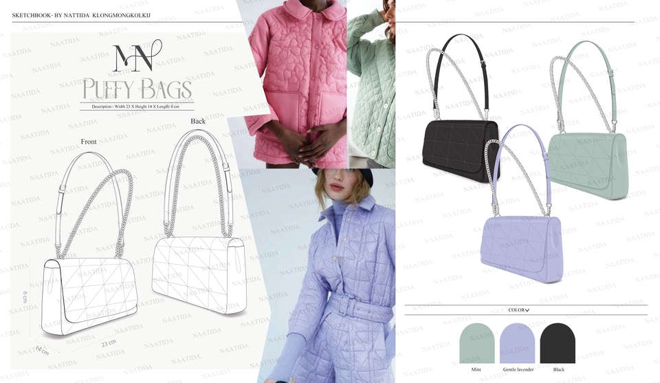 รับออกแบบกระเป๋าผู้หญิง-ผู้ชาย (Bag design) รับออกแบบเสื้อผ้า /ลายผ้า รับ Draft แบบตาม Ref ลูกค้า ((ระยะเวลาการทำงาน 10-15 ขึ้นอยู่กับความยากง่ายของแบบ )) ขั้นตอนการทำงาน 1. 1. รับบรีฟ คุยรายละเอียดงานกับลูกค้า ตาม concept , idea ของลูกค้า 2. 2. ออกแบบสเก็ตร่างคร่าวๆ 3. 3. ลง Details ต่างๆของเนื้องานที่เป็นไปตามบรีฟ (ระยะเวลาขึ้นอยู่กับความยาก ง่าย ของแบบ) 4. 4. ส่งแบบงาน ((โดยสามารถปรับแก้งานได้ 2 ครั้ง)) จากแบบที่เลือก