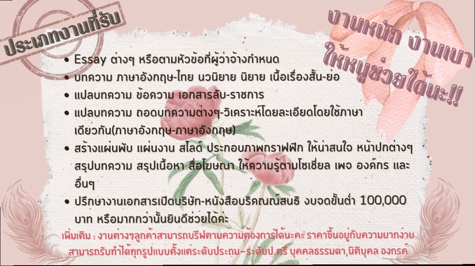 จบสาขาอังกฤษหลักสูตรนานาชาติ ป.ตรี รูปเเบบงานรับตั้งเเต่ มัธยมต้น-ระดับปริญญาตรี ไม่ว่าจะเป็นงานเเปล วิเคราะห์บทความ ถอดความหมายที่บทความสื่อให้ลึกซึ้งขึ้น สรุปความเป็นเเผ่น หรือเป็นหน้าๆไปได้ค่ะ ขั้นตอนการทำงาน 1. พูดคุยตามความต้องการของผลงาน 2. เริ่มทำผลงาน 3. ส่งให้ดูเป็นระยะ เพื่อความพอใจหรือการเเก้ไขเพิ่มเติม 4. เเล้วเสร็จจบงาน