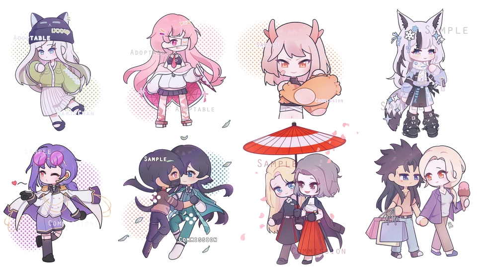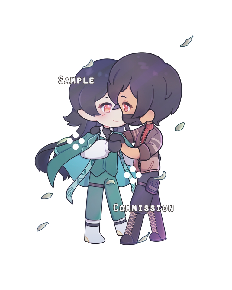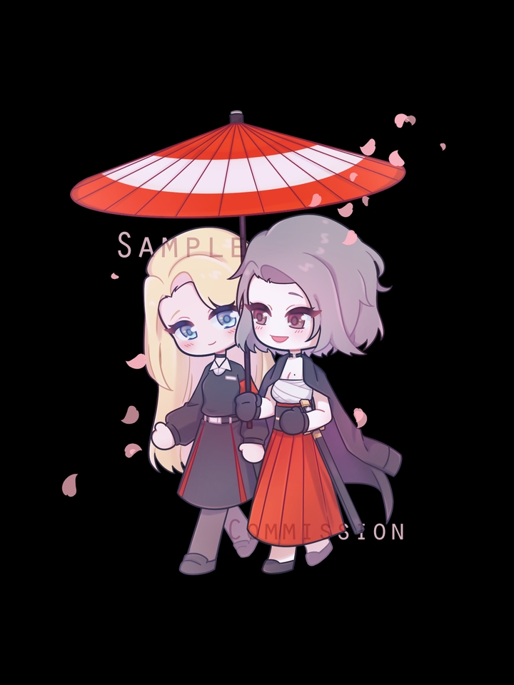 - ไฟล์งาน 2000 x 2000 px 300 dpi - รับวาดแบบเต็มตัวเท่านั้น - สามารถวาดได้ทั้งชายหญิง มาสคอตต่างๆ - มีการลดทอนรายละเอียดบางส่วน และบางท่าทางอาจไม่สามรถวาดได้ - ไม่รับวาดฉากหลัง แต่จะมีการตกแต่งฉากหลังให้เล็กน้อยตามตัวอย่างงาน ขั้นตอนการทำงาน 1. รับบรีฟจากลูกค้าเช่น ให้วาดใคร, ทำท่าทางแบบไหน, (ถ้ามีภาพประกอบจะทำให้เข้าใจได้ง่ายมากขึ้น) 2. เริ่มร่างภาพส่งให้ลูกค้า (สามารถแก้ไขได้ 3 ครั้ง) 3. ทำการตัดเส้นงานวาดให้ลูกค้า หากไม่มีแก้ไขจะไปขั้นตอนถัดไป (สามารถแก้ไขได้ 3 ครั้ง) 4. ส่งภาพลงสีคร่าวๆ ยังไม่มีการเก็บรายละเอียดเช่น แสง เงา และเอฟเฟค หากไม่มีแก้ไขจะไปขั้นตอนถัดไป (สามารถแก้ไขได้ 3 ครั้ง) 5. ส่งภาพให้ลูกค้าตรวจสอบเพื่อเป็นการยืนยันงานวาด (สามารถแก้ไขได้ 3 ครั้ง) 6. ทำการจัดส่งไฟล์ที่เสร็จสมบูรณ์ให้ลูกค้า
