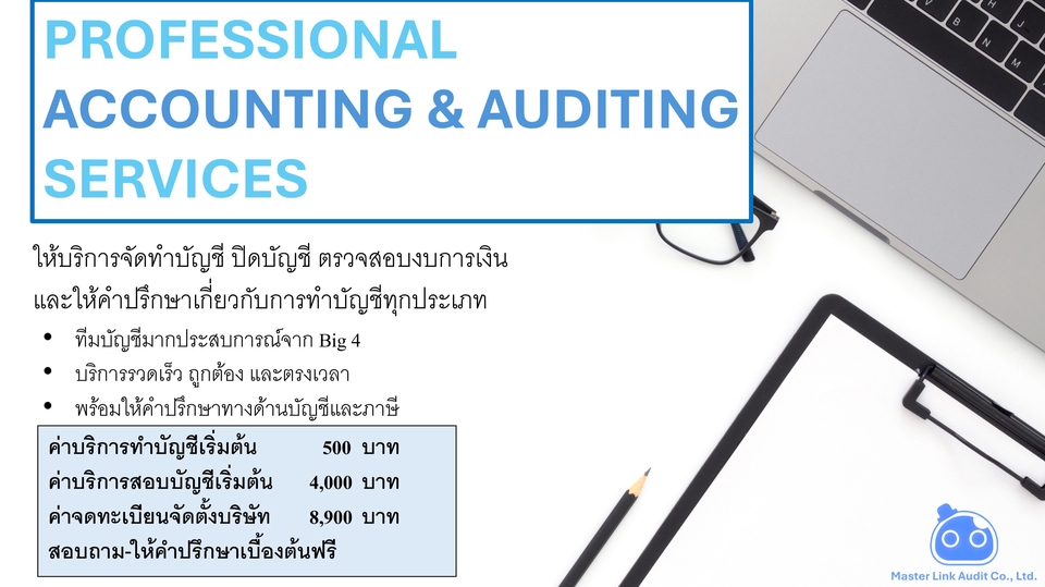 ฿5,000ค่าบริการขึ้นอยู่กับขนาดและความซับซ้อนของกิจการ งบเปล่าเริ่มต้นที่ 4,000 บาท