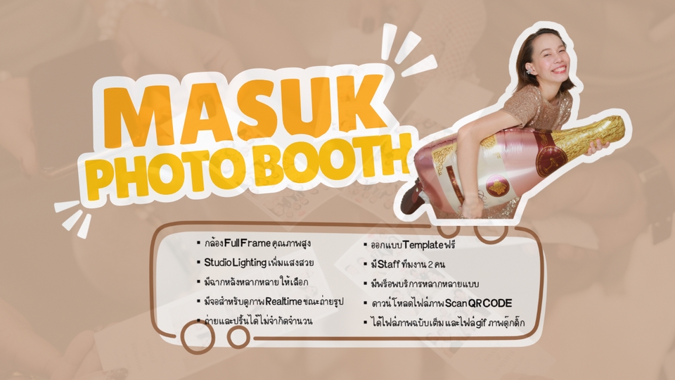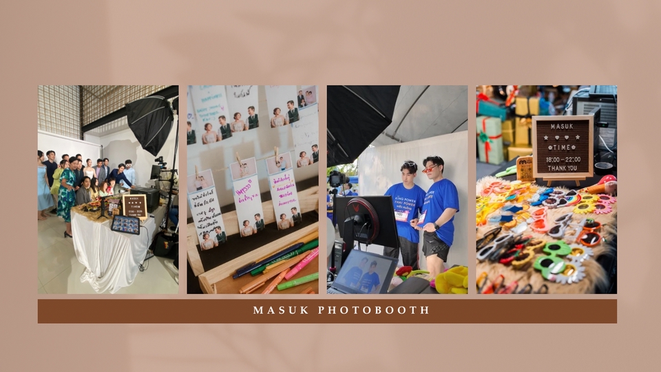 ▪️กล้อง Full Frame คุณภาพสูง ▪️Studio Lighting เพิ่มแสงสวย ▪️มีฉากหลังหลากหลายให้เลือก ▪️มีจอสำหรับดูกาพ Realtime ขณะถ่ายรูป ▪️ถ่าย และปริ้นได้ ไม่จำกัดจำนวน ▪️ออกแบบ Template ฟรี ▪️มี Staff ทีมงาน 2 คน ▪️มีพร็อพบริการหลากหลายแบบ ▪️ ดาวน์โหลดไฟล์ภาพ Scan QR CODE ▪️ ได้ไฟล์ภาพฉบับเต็ม และไฟล์ gif ภาพดุ๊กดิ๊ก (ส่งลิ้งไฟล์ภาพทั้งหมดให้ หลังจบงานภายใน 2วัน ) ขั้นตอนการทำงาน 1. เบื้องต้นสอบถามวันจัดงาน เช็คคิวงาน 2. สถานที่จัดงาน (ต่างจังหวัดจะมีค่าเดินทาง+เพิ่มเติม) 3. เลือกฉากหลัง 4. ทางทีมออกแบบ Template ให้ลูกค้าเลือก