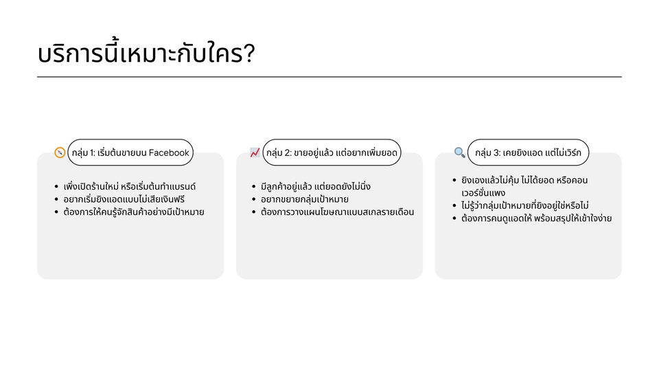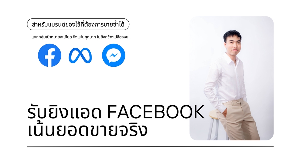 บริการยิงแอด Facebook แบบเจาะลึก วิเคราะห์ก่อนเริ่มจริงจัง วางแผนโฆษณาให้เหมาะกับสินค้าที่ขายซ้ำได้ เช่น ของใช้ประจำวัน หรือสินค้าที่ลูกค้าต้องซื้อซ้ำเป็นประจำ (ไม่รับอาหารเสริมหรือสินค้าที่ผิดนโยบาย) กลุ่มเป้าหมายถูกแยกอย่างละเอียด ไม่ยิงกว้างเปลืองงบ ช่วยคุมต้นทุน พร้อมวางโครงสร้างแคมเปญให้เหมาะกับจุดประสงค์ เช่น Conversations, Purchases, Leads, Value, Reach ลูกค้าดูผลลัพธ์ได้ตลอดจากระบบ Report ของ Facebook และเราจะสรุปผลแบบเข้าใจง่าย พร้อมแนะนำแผนการสเกลโฆษณาหากต้องการเพิ่มยอดขาย ขั้นตอนการทำงาน: 1. ประชุมออนไลน์ครั้งที่ 1 – พูดคุยเพื่อเก็บข้อมูลสินค้า กลุ่มเป้าหมาย และเป้าหมายทางธุรกิจ 2. วิเคราะห์ – วิเคราะห์คู่แข่ง โครงสร้างการตลาด และสื่อที่มีอยู่ 3. เสนอแผนโฆษณา – นำเสนอแนวทางยิงแอด พร้อมให้ลูกค้าตรวจสอบและปรับแก้ 4. ยืนยันและชำระเงิน – ชำระค่าบริการตามสัญญา 5. เริ่มรันแคมเปญ – เริ่มนับวันบริการเมื่อลงโฆษณาจริง 6. ติดตามผลและปรับแคมเปญ – Optimize แคมเปญและรายงานผลรายสัปดาห์ 7. ประชุมออนไลน์ครั้งที่ 2 – สรุปผลท้ายเดือน พร้อมข้อเสนอแนะเพื่อพัฒนาแคมเปญรอบถัดไป