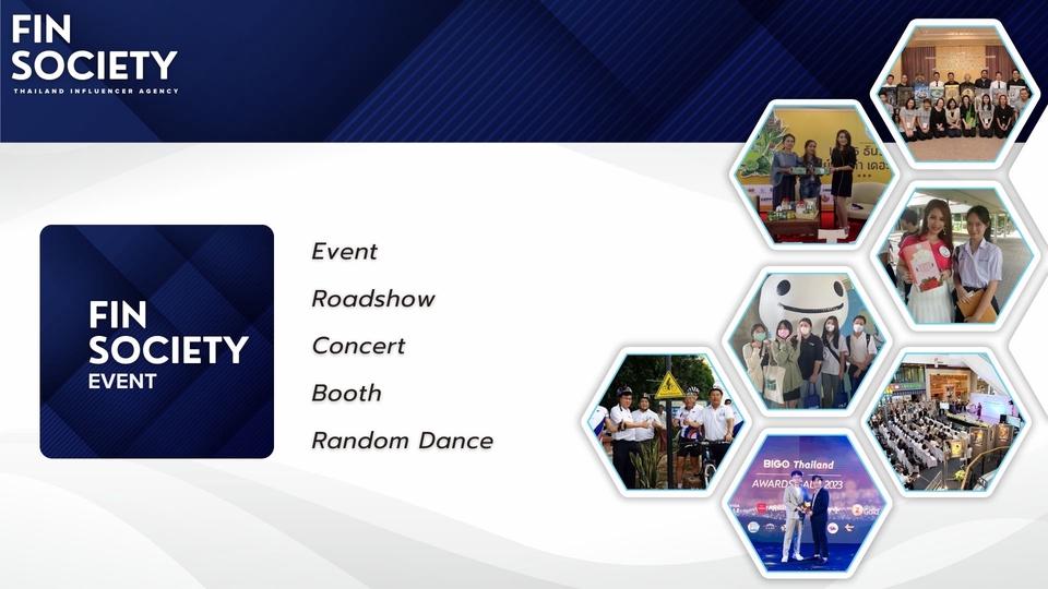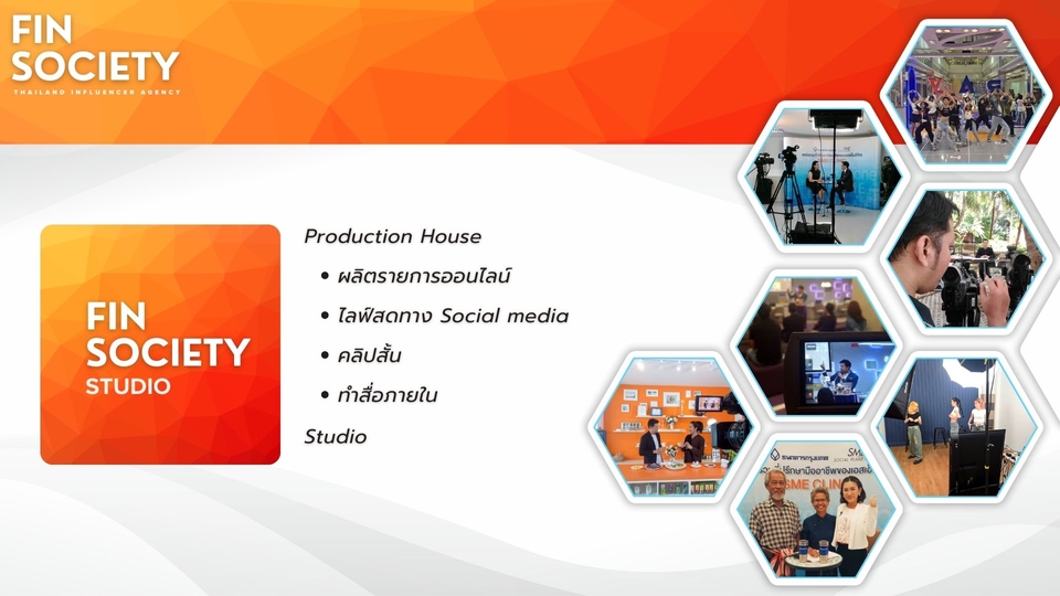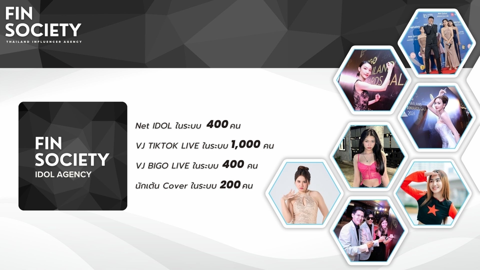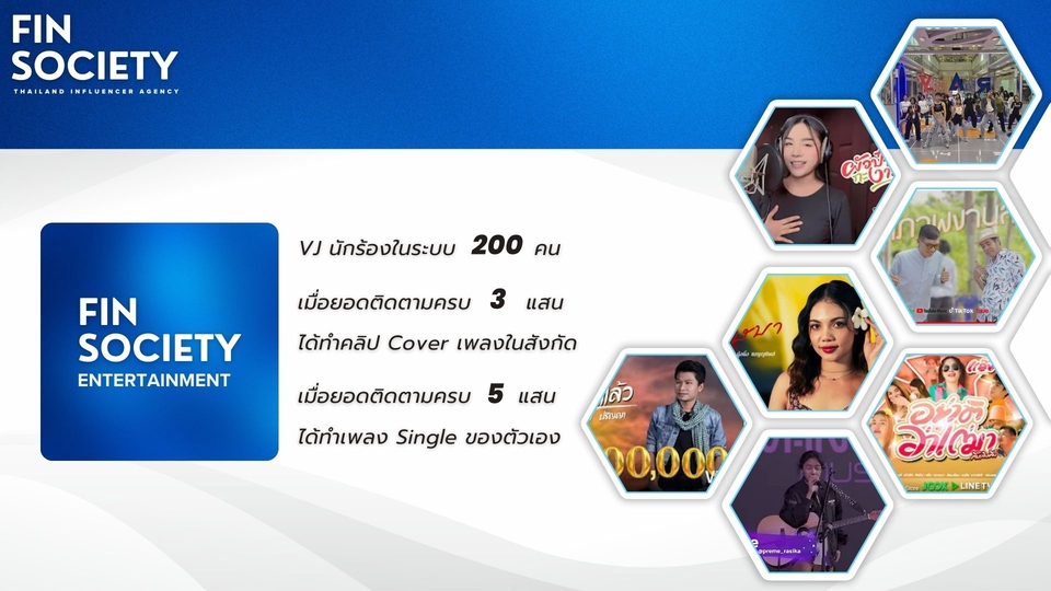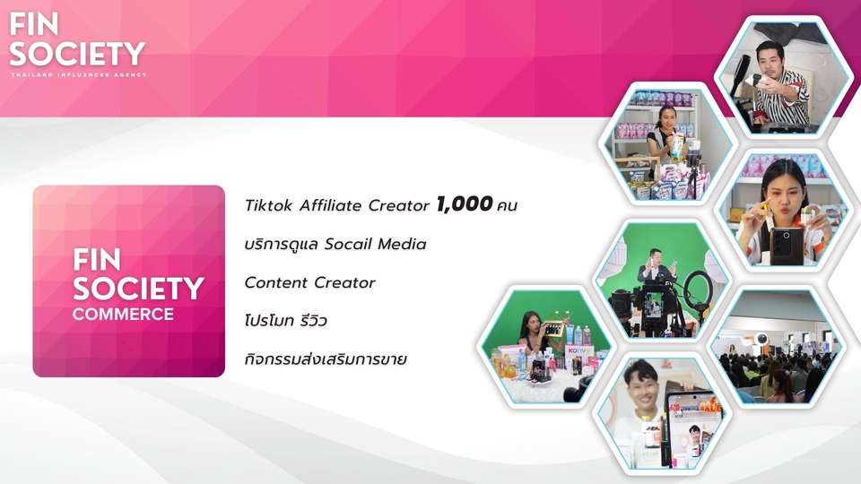Fin Society agency บริการวางแผนและจัดหา influencer Marketing ทุกแพลตฟอร์ม (โดยเฉพาะ Tiktok เราชำนาญมาก) วางแผน + จัดหา + ดำเนินการ + ประเมิณผล โดยทีมงานมืออาชีพ ขั้นตอนการทำงาน 1. รับบรีฟ 2. นำเสนอ 3. ส่งงาน