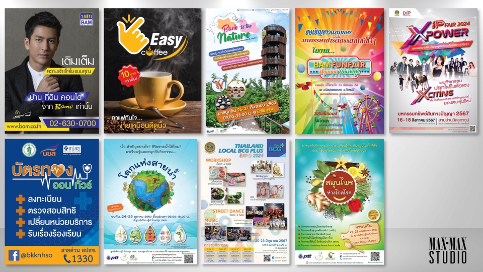 ขอต้อนรับสู่ MaxMax Studio นะครับ ลูกค้าที่กำลังมองหาคนออกแบบ/ทำอาร์ตเวิร์คสื่อสิ่งพิมพ์ หนังสือ โบรชัวร์ แบนเนอร์ โปสเตอร์ Ad โฆษณา การ์ด โลโก้ นามบัตร หัวจดหมาย ฯลฯ ไม่ว่าจะใช้ในงาน Event งานเปิดตัวสินค้า อบรม สัมมนา บูธขายสินค้า บูธนิทรรศการต่างๆ ในส่วนของ Key Visual งาน, Stage Backdrop, Photo Backdrop, J-Flag, Banner, Exhibition, Directory Board หรือในส่วนของสื่อประชาสัมพันธ์ทั้ง Poster, Web Banner, ภาพประกอบโพสต์, สูจิบัตรงาน, หนังสือ, บัตร Staff, Script MC และอื่นๆ สามารถเรียกใช้บริการได้ครับ ผมมีประสบการณ์ในงานต่างๆเหล่านี้มากมาย จะให้รับไปทำในส่วนไหน ลองแชทคุยราคากันก่อนได้ครับ สามารถทำกราฟิกรูปภาพ เรียบเรียงข้อมูล เขียน Copy ให้น่าสนใจ ตรวจปรู๊ฟให้ ไม่มีคำผิด (คือเป็น Copywriter+Art Director ในตัว) ที่สำคัญราคาย่อมเยาครับ ถ้าเยอะก็คิดราคาเหมาไป มีงานจุกจิกอะไรก็ทำให้หมดครับ ขั้นตอนการทำงาน 1. ลูกค้าบรีฟรายละเอียดงาน 2. เสนอราคา และออกแบบตามระยะเวลา 3. ปรับแก้ จำนวนครั้งตามความเหมาะสม 4. ลูกค้ายืนยันแบบงาน และ Upload งานขึ้นระบบ (ส่งมอบไฟล์ Ai)