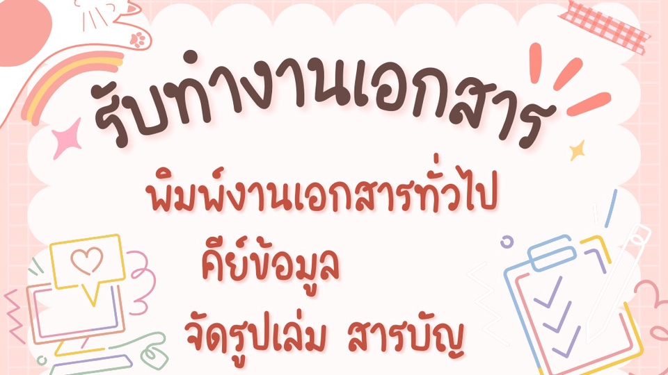 ลักษณะของงานที่รับค่ะ 1. รับพิมงานทุกชนิดตามที่ต้องการ เช่น Word, PDF 2. ภาษาไทยหรือภาษาอังกฤษ 3. พิมพ์จากเอกสารภาพถ่าย พิมพ์จากงานเขียนหนังสือ ตามที่ต้องการ 4. จัดรูปเล่ม สารบัญ ขั้นตอนการทำงาน 1. ผู้จ้างแจ้งรายละเอียดงานที่ต้องการ เช่น เอกสารต้นฉบับ รูปแบบและขนาดตัวอักษร 2. ตกลงราคาและกำหนดระยะเวลาทำงานและเวลาการส่งงาน