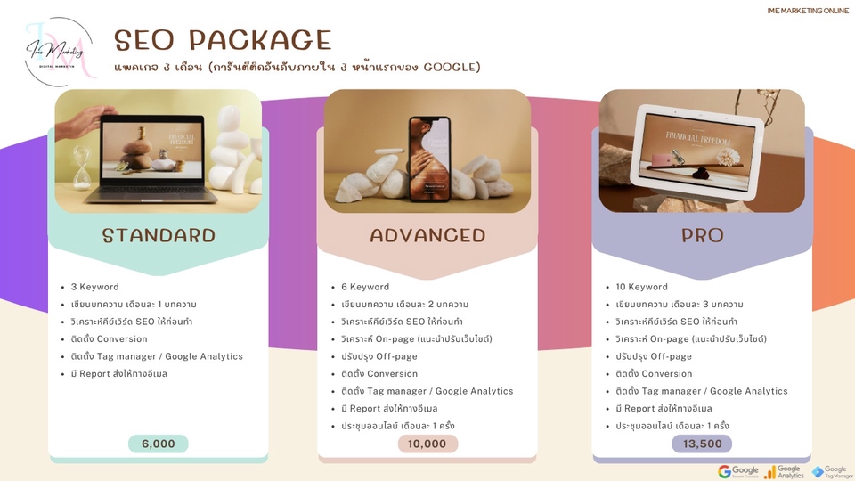 ฿10,000○ ลูกค้าเลือก 6 Keyword ที่ต้องการให้ติดอันดับ Google ทางเราแนะนำ Keyword สำหรับทำ SEO เพื่อให้ได้ผลลัพธ์ดีที่สุด ○ เขียนบทความ เดือนละ 2 บทความ (เนื้อหา 500 คำ เป็นเนื้อหาสำหรับทำ SEO ให้สอดคล้องกับธุรกิจของทางลูกค้า) ○ วิเคราะห์ On-page (แนะนำปรับเว็บไซต์) ○ ปรับปรุง Off-page ○ พร้อมติดตั้ง Conversion ○ ติดตั้ง Tag manager / Google Analytics ○ มี Report ส่งให้ทางอีเมล เดือนละ 1 ครั้ง ○ ประชุมออนไลน์ เดือนละ 1 ครั้ง