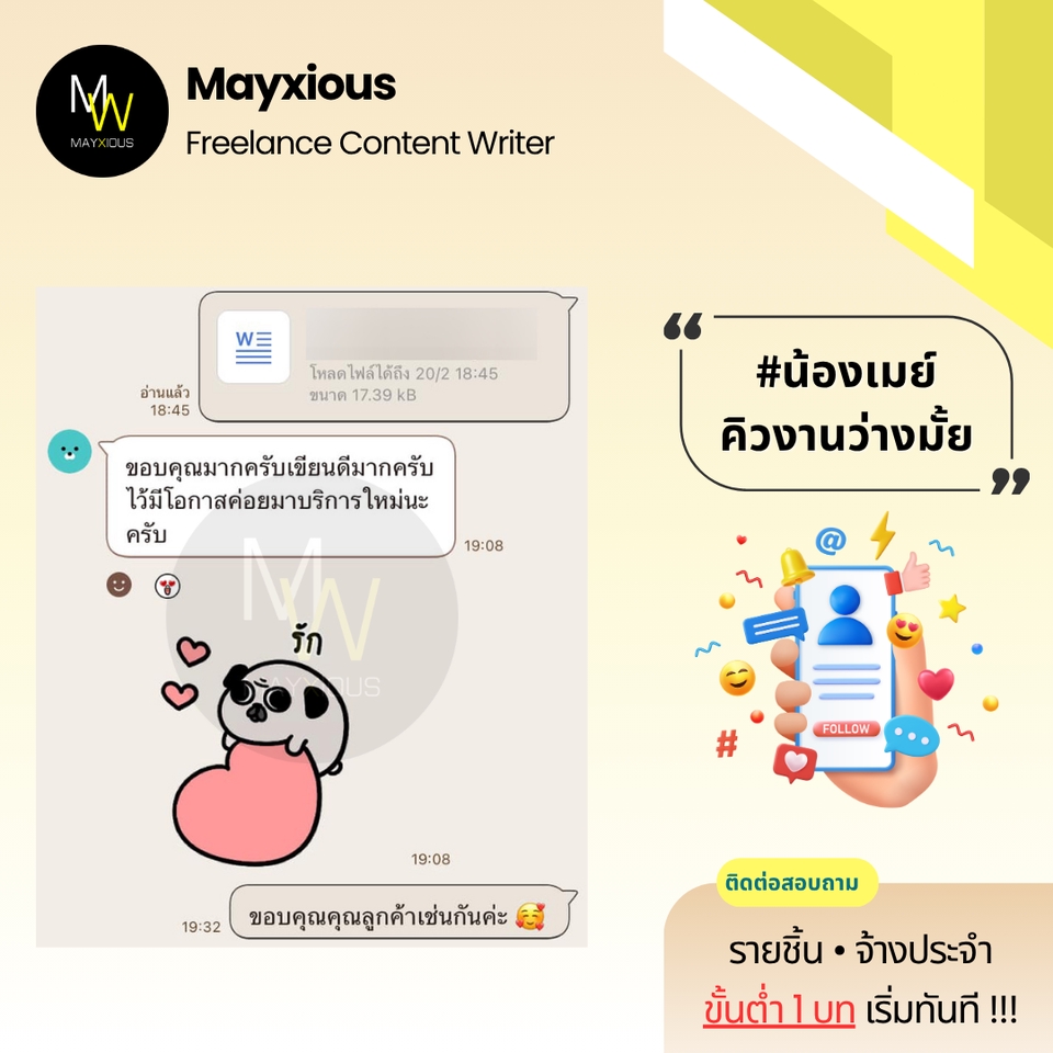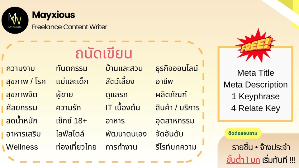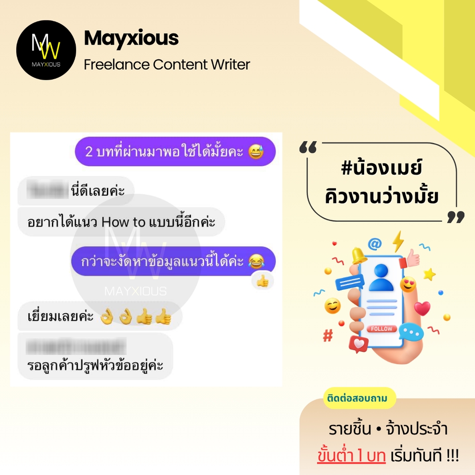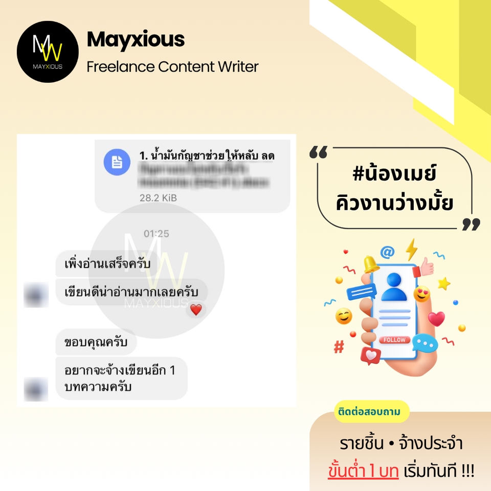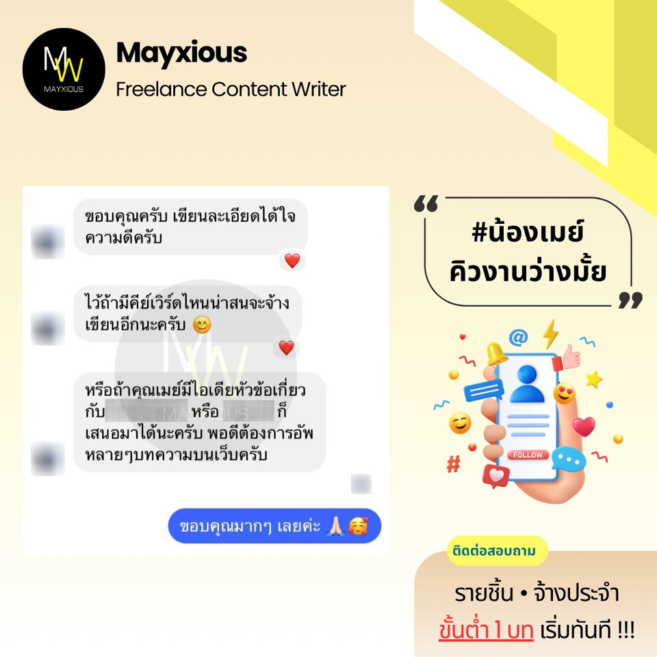 รับเขียนบทความคุณภาพหลากหลายแนว (ภาษาไทย) ประสบการณ์เขียนบทความ Full-Time ตั้งแต่ปี 2559 - ปัจจุบัน สร้างภาพลักษณ์แบรนด์ที่ดี น่าเชื่อถือ เพิ่มการมองเห็นบน Search Engine ดึงดูดกลุ่มเป้าหมาย และกระตุ้นตัดสินใจด้วยข้อมูลคุณภาพที่มีประโยชน์ 🌟 Evergreen Content 🌟 Value Content 🌟 SEO Content 🌟 SEM Content 🌟 Review Content 🌟 Rewrite Content 🌟 Social Media Content 🌟 ดูแลบทความ Website ✅ Starter 1-9 บท 500 คำ / บทละ 400 บาท 800 คำ / บทละ 650 บาท ✅ Cost Saver 10-19 บท 500 คำ / บทละ 350 บาท 800 คำ / บทละ 550 บาท ✅ Hot Deal 20 บทขึ้นไป 500 คำ / บทละ 300 บาท 800 คำ / บทละ 450 บาท ‼️ ถนัดเขียน ‼️ • ความงาม • สุขภาพ/โรค • สุขภาพจิต • ลดน้ำหนัก • ศัลยกรรม • ทันตกรรม • อาหารเสริม • Wellness • แม่และเด็ก • ผู้ชาย • เซ็กส์ 18+ • ความรัก • ไลฟ์สไตล์ • เที่ยวไทย • บ้าน/สวน • สัตว์เลี้ยง • ดูแลรถ • IT เบื้องต้น • พัฒนาตนเอง • การทำงาน • อาชีพ • ธุรกิจออนไลน์ • อาหาร • อุตสาหกรรม • ผลิตภัณฑ์ • สินค้า / บริการ • จัดอันดับ • รีไรท์บทความ ‼️ ไม่รับเขียน / ไม่ถนัด ‼️ • สายเทา • การพนัน • กีฬา • กฎหมาย • การเมือง • การเงิน • รีวิวซีรีส์/ภาพยนตร์ • อสังหาฯ • ยิงแอด • คอนเทนต์ขาย • งานแปล • ถอดเสียง • วิชาการ • การบ้าน • รายงาน • จดหมาย • เรียงความ • สุนทรพจน์ • วิทยานิพนธ์ • เอกสารราชการ • เอกสารสำคัญ สอบถามและดูตัวอย่างงานได้ค่ะ (เฉพาะบทความ) ขั้นตอนการทำงาน 1. ผู้จ้างสอบถามพูดคุยรายละเอียดงานหรือแจ้งแนวทางความต้องการ 2. ไม่รับติดต่องานทางช่องทางอื่น ๆ ทุกช่องทาง นอกจากช่องทาง Fastwork เท่านั้น 3. ผู้จ้างและฟรีแลนซ์ทำการตกลงราคา ฟรีแลนซ์เสนอใบราคา ผู้จ้างกดชำระเงิน 4. ฟรีแลนซ์ทำงานตามบรีฟ และส่งมอบงานเป็นไฟล์ PDF ให้ตรวจงาน 5. แก้ไขงานจากเค้าโครงเดิมได้ฟรี 2 ครั้ง ต่อไปครั้งละ 50 บาท 6. ส่งไฟล์งาน Words ขั้นตอนสุดท้ายเข้าระบบเพื่อปิดงาน