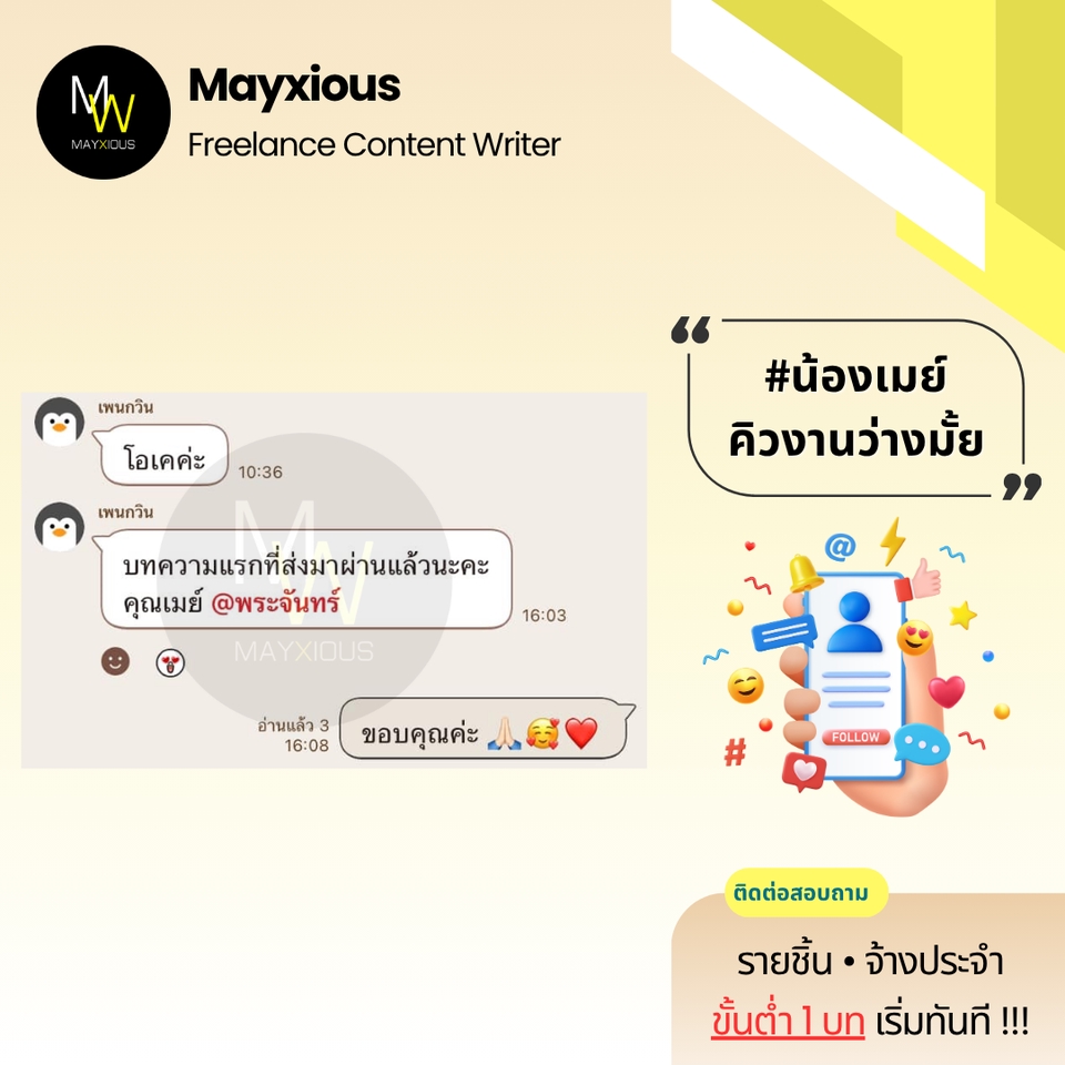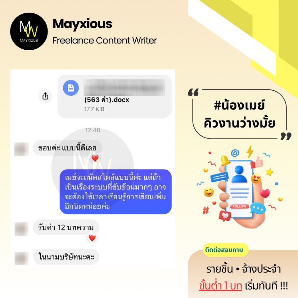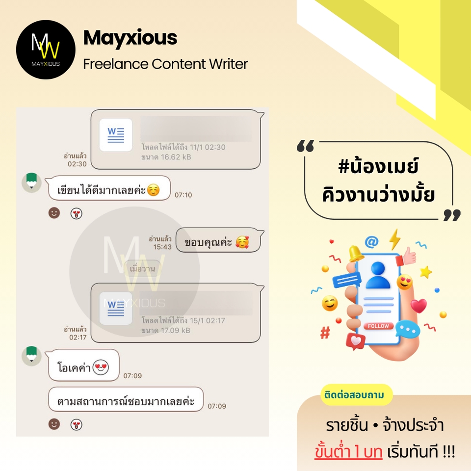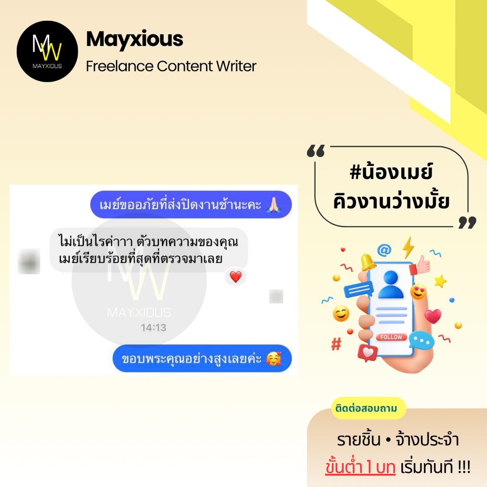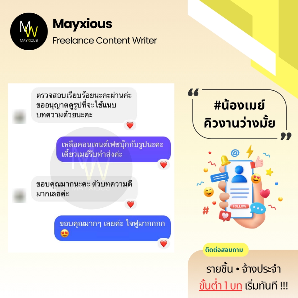 รับเขียนบทความคุณภาพหลากหลายแนว (ภาษาไทย) ประสบการณ์เขียนบทความ Full-Time ตั้งแต่ปี 2559 - ปัจจุบัน สร้างภาพลักษณ์แบรนด์ที่ดี น่าเชื่อถือ เพิ่มการมองเห็นบน Search Engine ดึงดูดกลุ่มเป้าหมาย และกระตุ้นตัดสินใจด้วยข้อมูลคุณภาพที่มีประโยชน์ 🌟 Evergreen Content 🌟 Value Content 🌟 SEO Content 🌟 SEM Content 🌟 Review Content 🌟 Rewrite Content 🌟 Social Media Content 🌟 ดูแลบทความ Website ✅ Starter 1-9 บท 500 คำ / บทละ 400 บาท 800 คำ / บทละ 650 บาท ✅ Cost Saver 10-19 บท 500 คำ / บทละ 350 บาท 800 คำ / บทละ 550 บาท ✅ Hot Deal 20 บทขึ้นไป 500 คำ / บทละ 300 บาท 800 คำ / บทละ 450 บาท ‼️ ถนัดเขียน ‼️ • ความงาม • สุขภาพ/โรค • สุขภาพจิต • ลดน้ำหนัก • ศัลยกรรม • ทันตกรรม • อาหารเสริม • Wellness • แม่และเด็ก • ผู้ชาย • เซ็กส์ 18+ • ความรัก • ไลฟ์สไตล์ • เที่ยวไทย • บ้าน/สวน • สัตว์เลี้ยง • ดูแลรถ • IT เบื้องต้น • พัฒนาตนเอง • การทำงาน • อาชีพ • ธุรกิจออนไลน์ • อาหาร • อุตสาหกรรม • ผลิตภัณฑ์ • สินค้า / บริการ • จัดอันดับ • รีไรท์บทความ ‼️ ไม่รับเขียน / ไม่ถนัด ‼️ • สายเทา • การพนัน • กีฬา • กฎหมาย • การเมือง • การเงิน • รีวิวซีรีส์/ภาพยนตร์ • อสังหาฯ • ยิงแอด • คอนเทนต์ขาย • งานแปล • ถอดเสียง • วิชาการ • การบ้าน • รายงาน • จดหมาย • เรียงความ • สุนทรพจน์ • วิทยานิพนธ์ • เอกสารราชการ • เอกสารสำคัญ สอบถามและดูตัวอย่างงานได้ค่ะ (เฉพาะบทความ) ขั้นตอนการทำงาน 1. ผู้จ้างสอบถามพูดคุยรายละเอียดงานหรือแจ้งแนวทางความต้องการ 2. ไม่รับติดต่องานทางช่องทางอื่น ๆ ทุกช่องทาง นอกจากช่องทาง Fastwork เท่านั้น 3. ผู้จ้างและฟรีแลนซ์ทำการตกลงราคา ฟรีแลนซ์เสนอใบราคา ผู้จ้างกดชำระเงิน 4. ฟรีแลนซ์ทำงานตามบรีฟ และส่งมอบงานเป็นไฟล์ PDF ให้ตรวจงาน 5. แก้ไขงานจากเค้าโครงเดิมได้ฟรี 2 ครั้ง ต่อไปครั้งละ 50 บาท 6. ส่งไฟล์งาน Words ขั้นตอนสุดท้ายเข้าระบบเพื่อปิดงาน