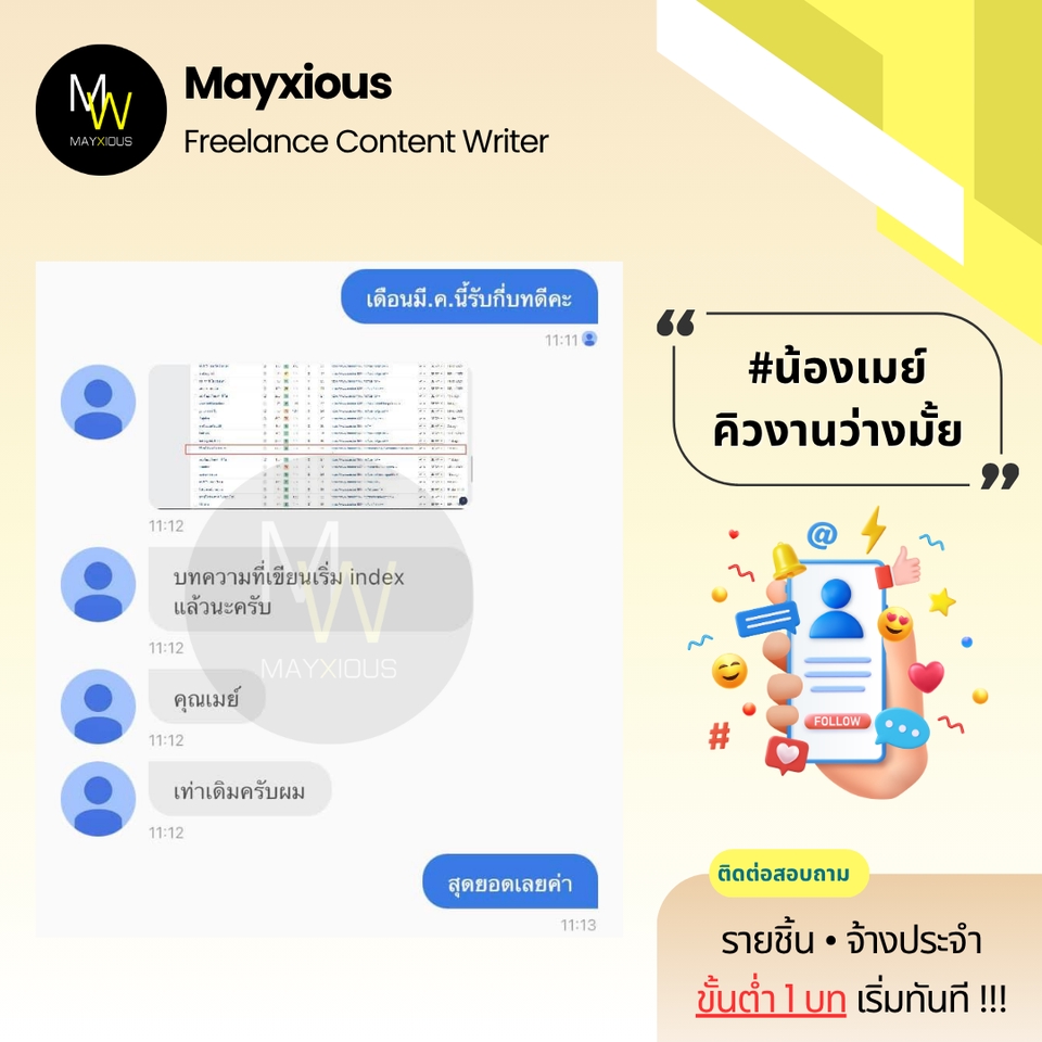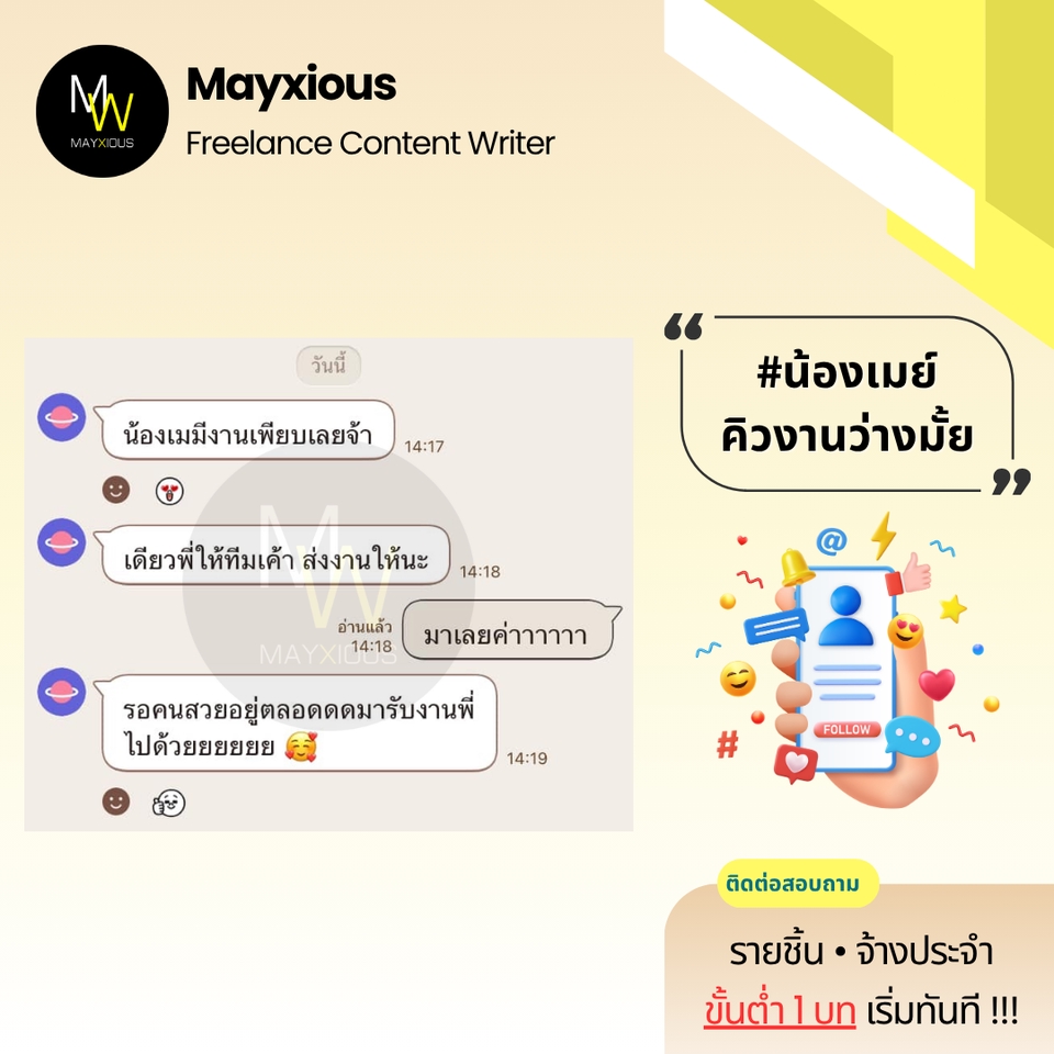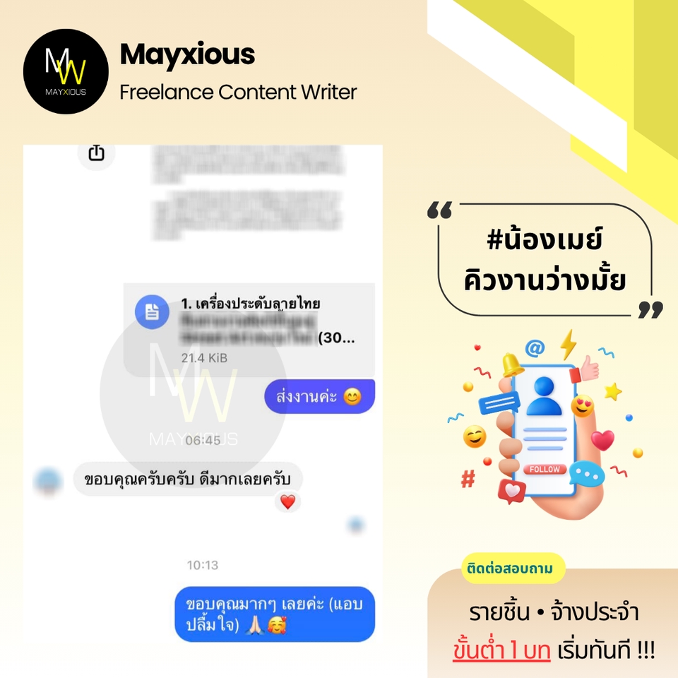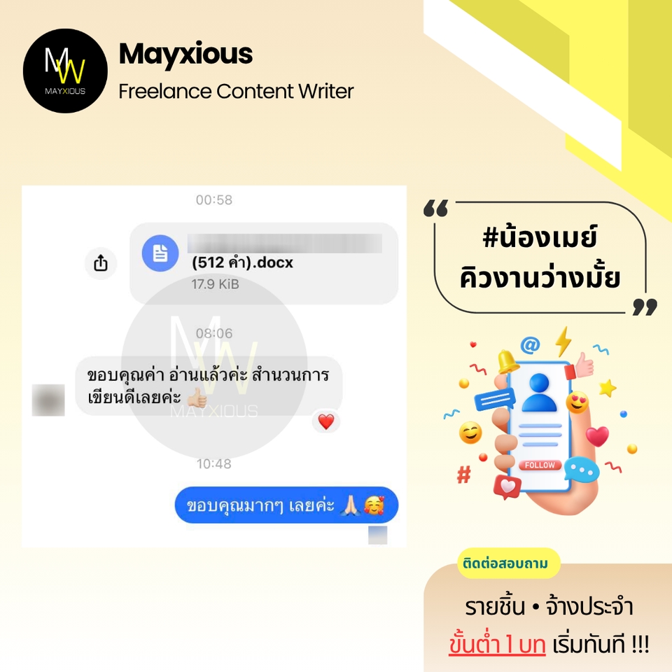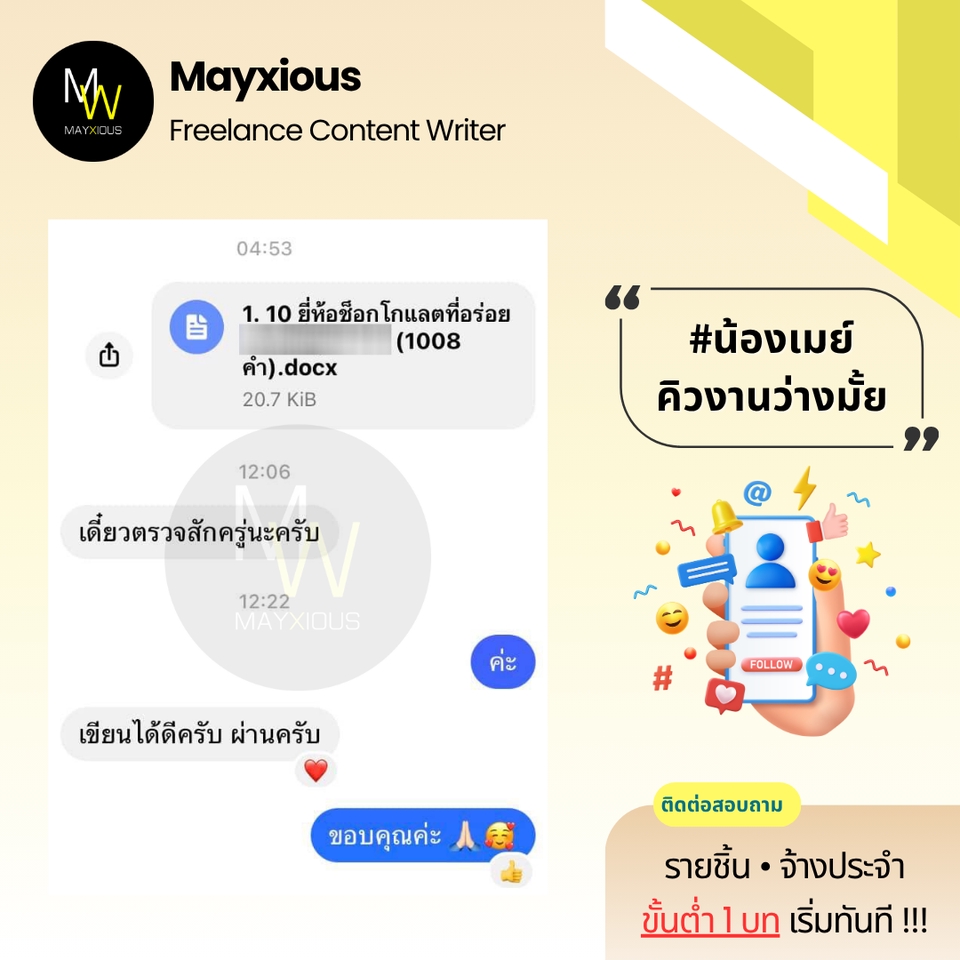 รับเขียนบทความคุณภาพหลากหลายแนว (ภาษาไทย) ประสบการณ์เขียนบทความ Full-Time ตั้งแต่ปี 2559 - ปัจจุบัน สร้างภาพลักษณ์แบรนด์ที่ดี น่าเชื่อถือ เพิ่มการมองเห็นบน Search Engine ดึงดูดกลุ่มเป้าหมาย และกระตุ้นตัดสินใจด้วยข้อมูลคุณภาพที่มีประโยชน์ 🌟 Evergreen Content 🌟 Value Content 🌟 SEO Content 🌟 SEM Content 🌟 Review Content 🌟 Rewrite Content 🌟 Social Media Content 🌟 ดูแลบทความ Website ✅ Starter 1-9 บท 500 คำ / บทละ 400 บาท 800 คำ / บทละ 650 บาท ✅ Cost Saver 10-19 บท 500 คำ / บทละ 350 บาท 800 คำ / บทละ 550 บาท ✅ Hot Deal 20 บทขึ้นไป 500 คำ / บทละ 300 บาท 800 คำ / บทละ 450 บาท ‼️ ถนัดเขียน ‼️ • ความงาม • สุขภาพ/โรค • สุขภาพจิต • ลดน้ำหนัก • ศัลยกรรม • ทันตกรรม • อาหารเสริม • Wellness • แม่และเด็ก • ผู้ชาย • เซ็กส์ 18+ • ความรัก • ไลฟ์สไตล์ • เที่ยวไทย • บ้าน/สวน • สัตว์เลี้ยง • ดูแลรถ • IT เบื้องต้น • พัฒนาตนเอง • การทำงาน • อาชีพ • ธุรกิจออนไลน์ • อาหาร • อุตสาหกรรม • ผลิตภัณฑ์ • สินค้า / บริการ • จัดอันดับ • รีไรท์บทความ ‼️ ไม่รับเขียน / ไม่ถนัด ‼️ • สายเทา • การพนัน • กีฬา • กฎหมาย • การเมือง • การเงิน • รีวิวซีรีส์/ภาพยนตร์ • อสังหาฯ • ยิงแอด • คอนเทนต์ขาย • งานแปล • ถอดเสียง • วิชาการ • การบ้าน • รายงาน • จดหมาย • เรียงความ • สุนทรพจน์ • วิทยานิพนธ์ • เอกสารราชการ • เอกสารสำคัญ สอบถามและดูตัวอย่างงานได้ค่ะ (เฉพาะบทความ) ขั้นตอนการทำงาน 1. ผู้จ้างสอบถามพูดคุยรายละเอียดงานหรือแจ้งแนวทางความต้องการ 2. ไม่รับติดต่องานทางช่องทางอื่น ๆ ทุกช่องทาง นอกจากช่องทาง Fastwork เท่านั้น 3. ผู้จ้างและฟรีแลนซ์ทำการตกลงราคา ฟรีแลนซ์เสนอใบราคา ผู้จ้างกดชำระเงิน 4. ฟรีแลนซ์ทำงานตามบรีฟ และส่งมอบงานเป็นไฟล์ PDF ให้ตรวจงาน 5. แก้ไขงานจากเค้าโครงเดิมได้ฟรี 2 ครั้ง ต่อไปครั้งละ 50 บาท 6. ส่งไฟล์งาน Words ขั้นตอนสุดท้ายเข้าระบบเพื่อปิดงาน