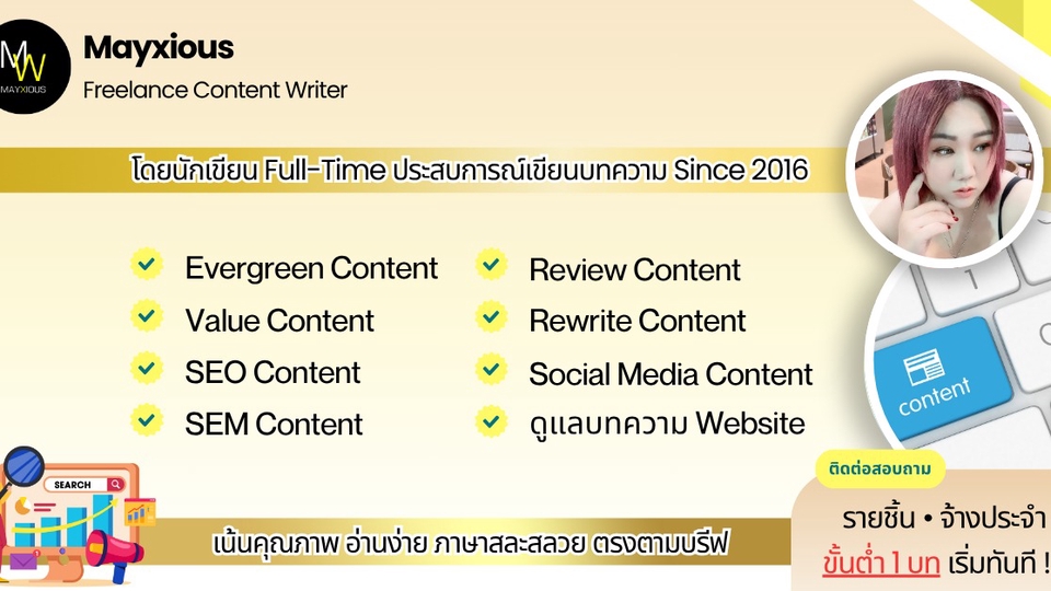 รับเขียนบทความทั่วไป / บทความคุณภาพ / SEO / SEM / บทความรีวิว / บทความรีไรท์ / แคปชั่นโพสต์
